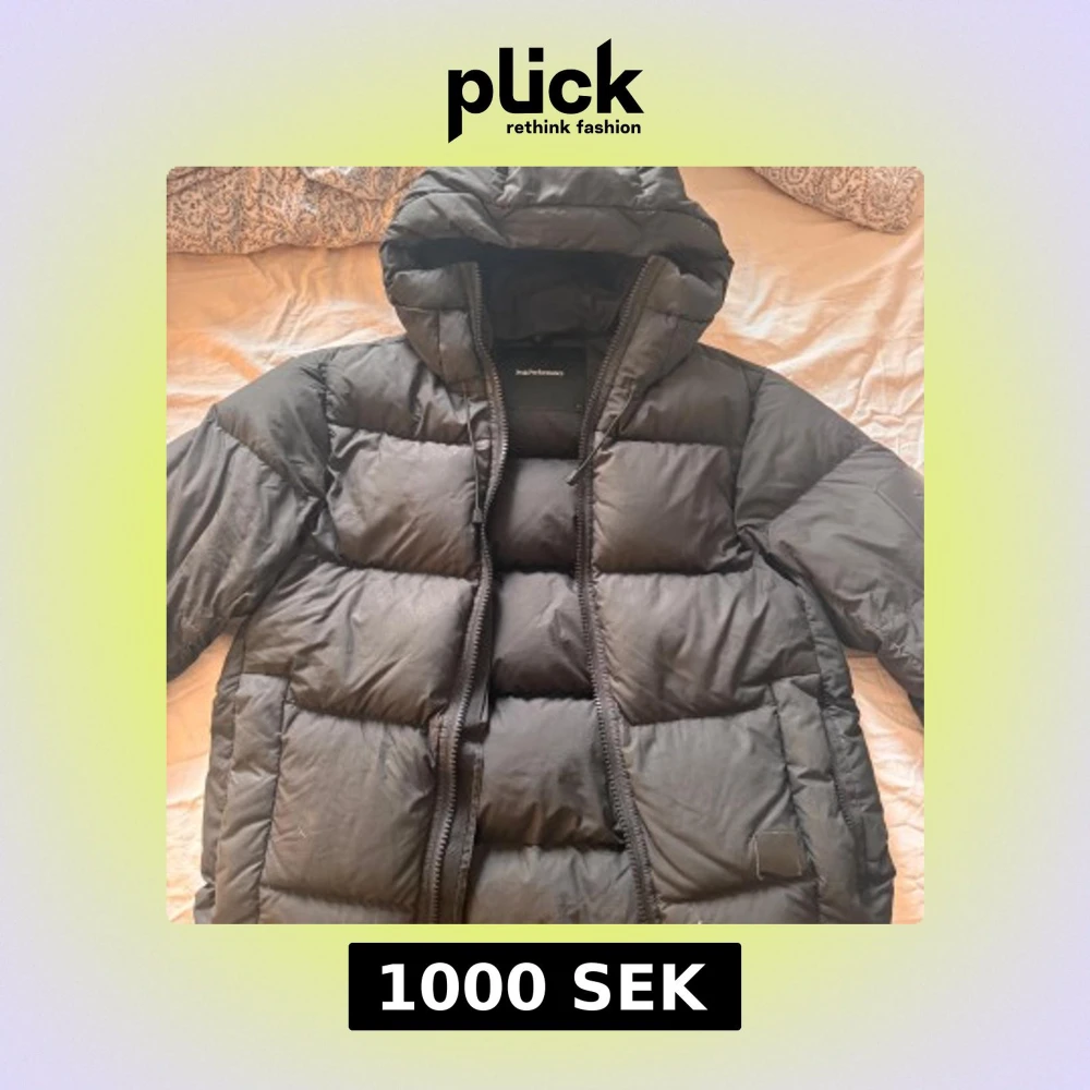 Säljer en svart dunjacka från Peak Performance med huva och dragkedja. Jackan har en quiltad design och är i bra skick förutom med de hålet som visas på bilden där kaj gjort en enkel lösning med en tejpbit men kan säkert fixas om man kan sy.