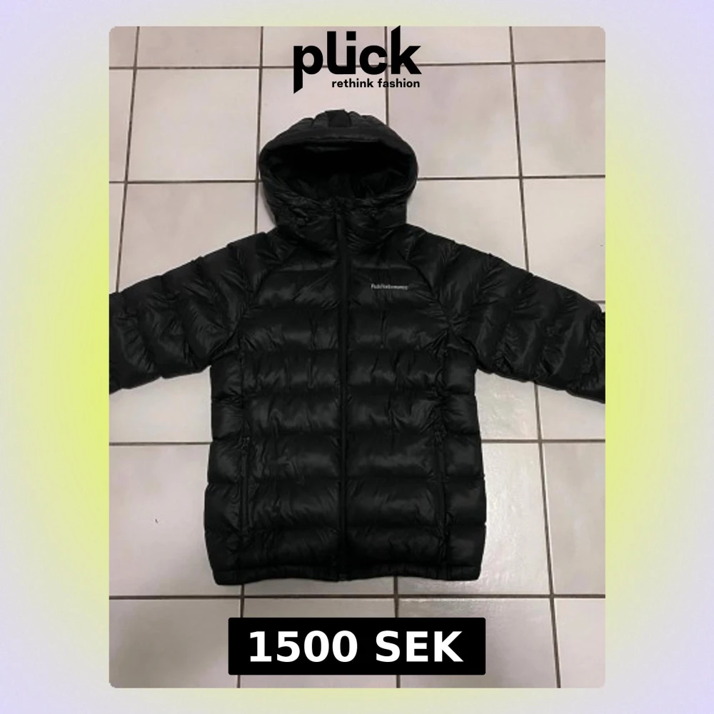 Säljer en svart dunjacka från Peak Performance med huva och dragkedja framtill. Dam strl S. Sparsamt använd i nyskick