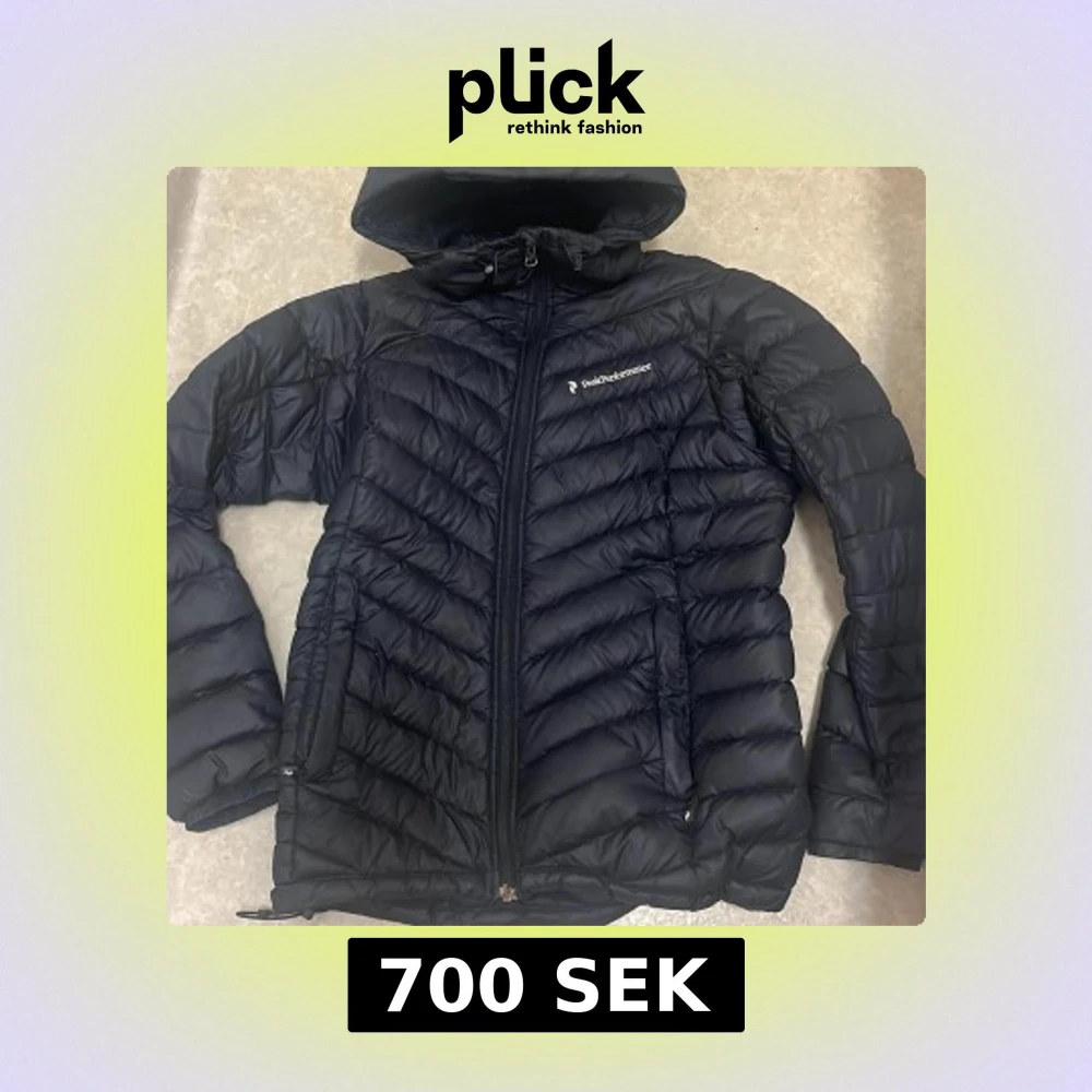 Säljer en svart dunjacka från Peak Performance i storlek S. Jackan har huva, dragkedja framtill och två fickor med dragkedja. Snyggt mönstrad med chevron-sömmar och logga på bröstet. Perfekt för kalla dagar och riktigt skön att bära.
