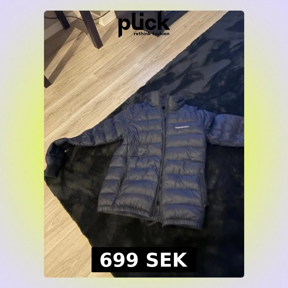 Säljer en mörkblå dunjacka från Peak Performance med horisontella quiltade paneler och dragkedja framtill. Jackan har två sidofickor med dragkedja och en hög krage. Perfekt för kalla dagar och har en clean, sportig look. Och har ett litet hål i en av armarna