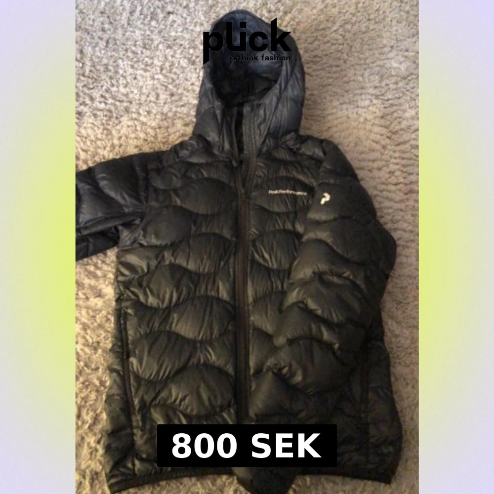 Svart dunjacka från Peak Performance i storlek S. Jackan har huva, snygg quiltad design och dragkedja framtill. Perfekt för kalla dagar och har en stilren look med diskret logga på bröstet och ärmen. Passar dig som gillar funktion och enkel stil.