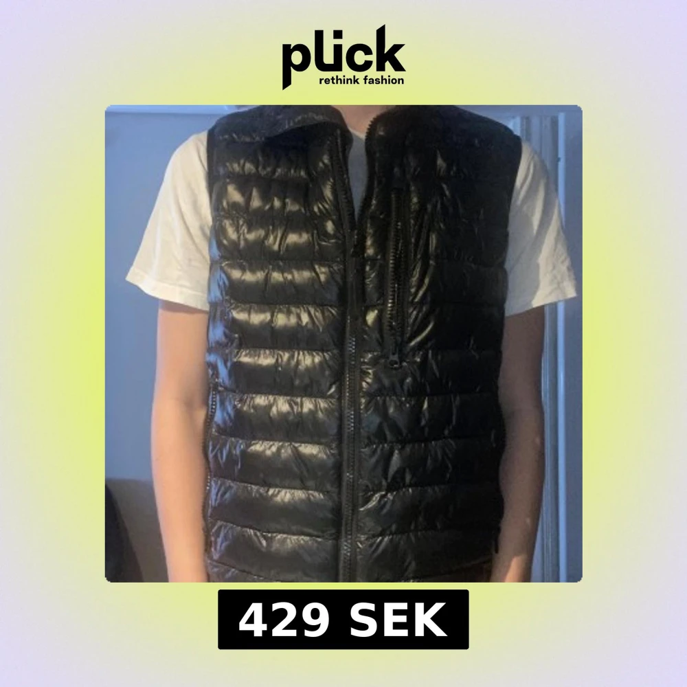 Säljer en stilren svart dunväst med dragkedja. Västen har en hög krage och flera praktiska fickor med dragkedjor. Perfekt för våren som kommer. Skriv vid gärna vid frågor