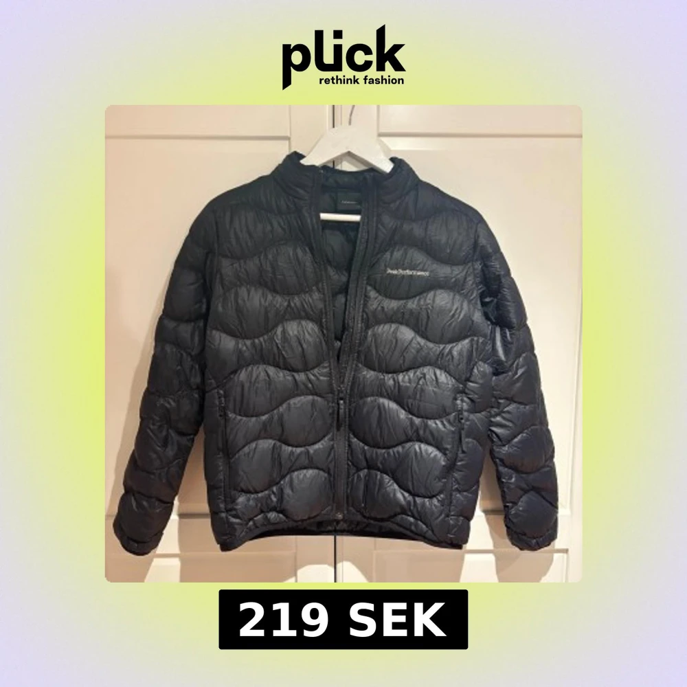 Svart dunjacka från Peak Performance med vågigt quiltat mönster och diskret logga på bröstet. Jackan har hög krage, två sidofickor med dragkedja och långärmade ärmar. Perfekt för kalla dagar och har en snygg, sportig look.