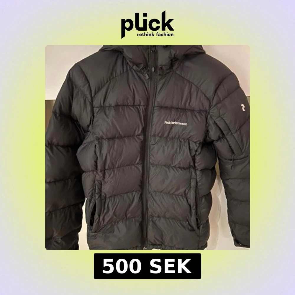 Svart pufferjacka från Peak Performance i storlek S. Jackan har huva, dragkedja framtill och två sidofickor. Diskret logga på bröstet och ärmen. Perfekt för kalla dagar med sin fluffiga och isolerande design. Materialet är syntet och dun. Ett litet hål vid ena ärmen men annars i bra skick (kolla sista bilden)