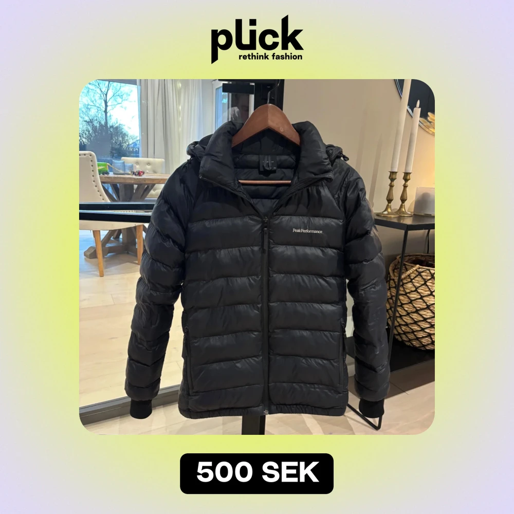 Säljer en svart dunjacka från Peak Performance i bra skick. Jackan är perfekt för vintern med sin pufferstil och långa ärmar. Den har en praktisk dragkedja och en mysig huva. Perfekt för kalla dagar tyvär en liten reva på baksidan av jackan men där av priset men borde inte va så svårt att fixa