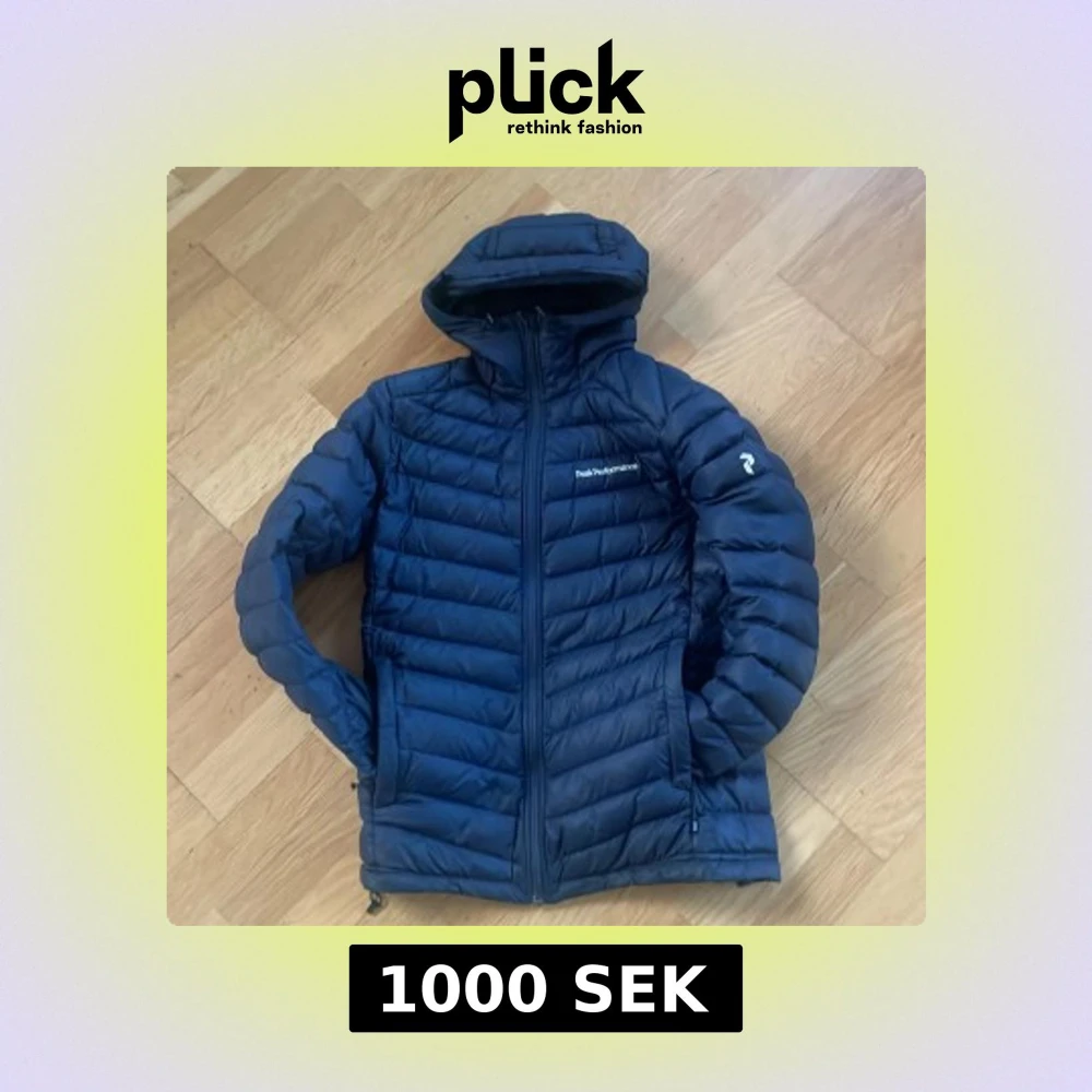 Snygg mörkblå dunjacka från Peak Performance med huva och dragkedja framtill. Jackan är quiltad och har logga på bröstet och ärmen. Perfekt för kyliga dagar och enkel att matcha med det mesta.