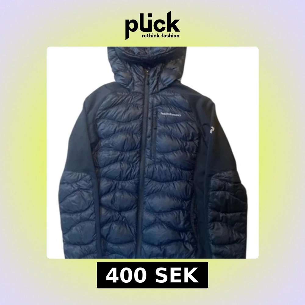 Säljer en svart dunjacka från Peak Performance med huva och dragkedja. Jackan har en quiltad design och är perfekt för kyligare väder. Den är långärmad och har en stilren look.
