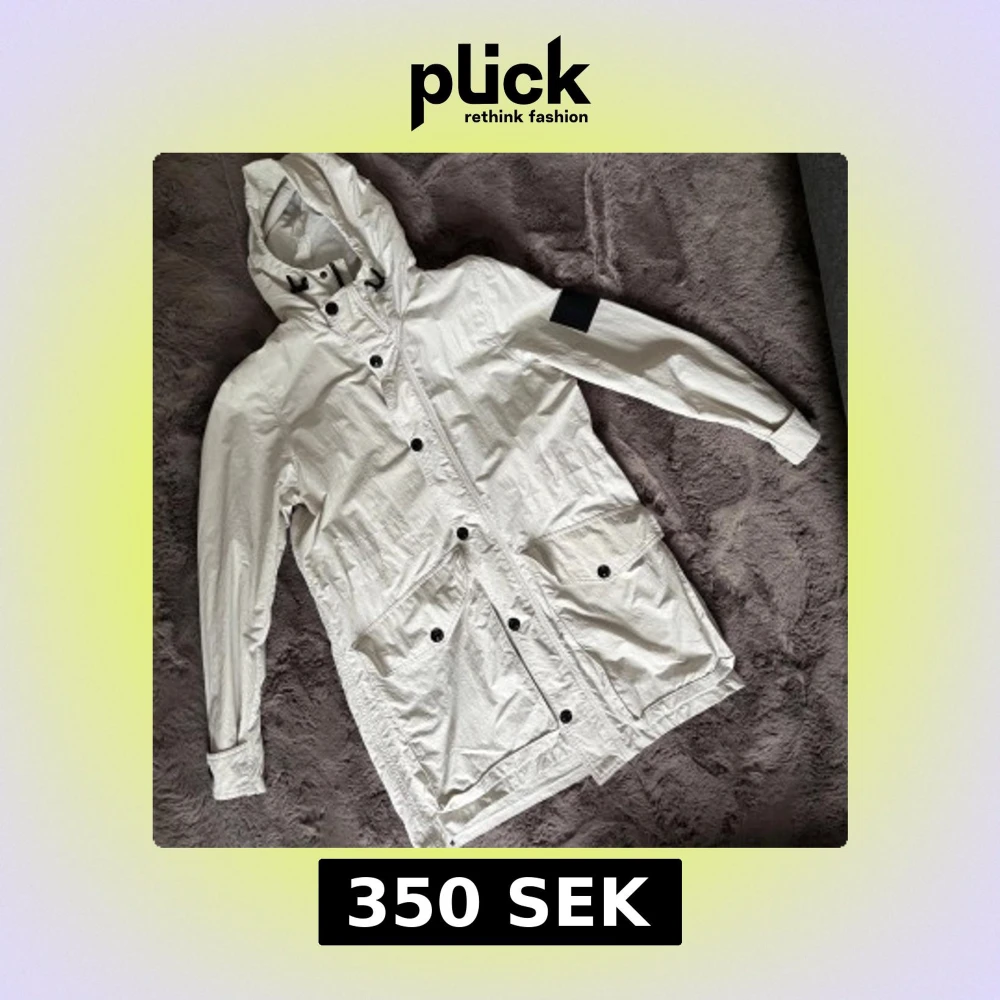 Snygg vit parkajacka från Peak Performance med huva, stora fickor framtill och svarta knappar. Jackan har en svart patch på ärmen och är tillverkad i ett lätt och slitstarkt material. Perfekt för dig som vill ha en clean och stilren look.
