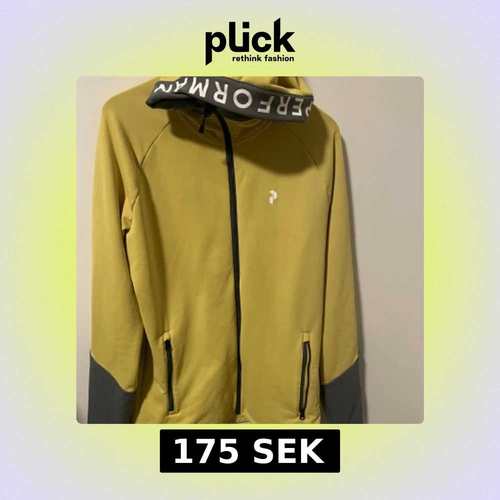 Snygg gul hoodie med grå detaljer och dragkedja framtill. Perfekt för en sportig look med text på huvan. Långärmad design med praktiska fickor. Använd fåtal gånger därmed mycket fint skick, Storlek : S