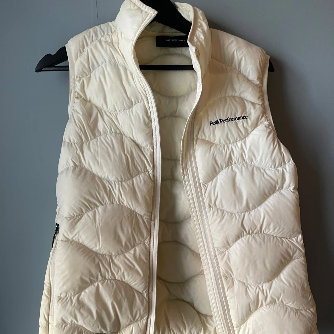 Snygg vit dunväst från Peak Performance med vågformat quiltat mönster. Västen har hög krage, dragkedja framtill och två fickor med dragkedja. Perfekt för lager-på-lager och stilren look.