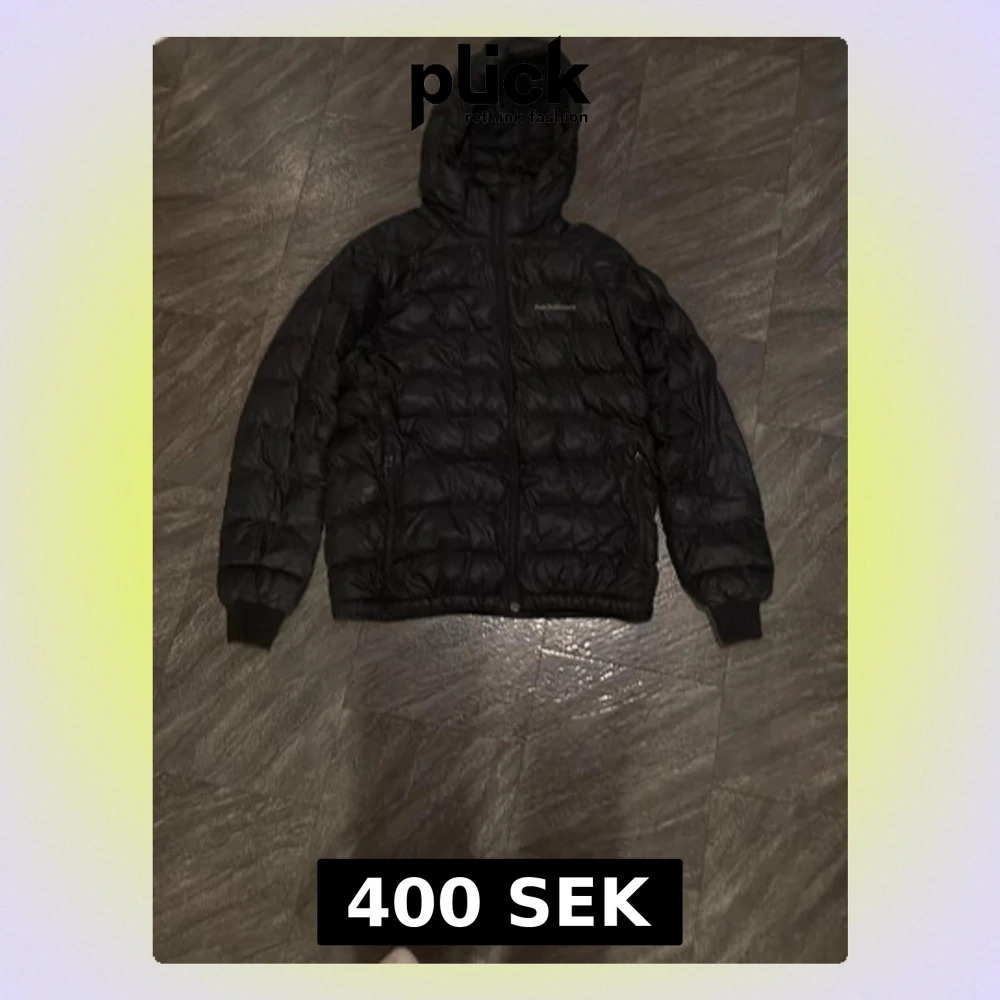 Säljer en svart pufferjacka från Peak Performance med huva och dragkedja framtill. Jackan är quiltad och har långa ärmar med muddar. Perfekt för kalla dagar och riktigt skön att bära. Klassisk och stilren design som funkar till det mesta. Har ett litet hål på armen som kan sy ihop hos en som jobbar med textil