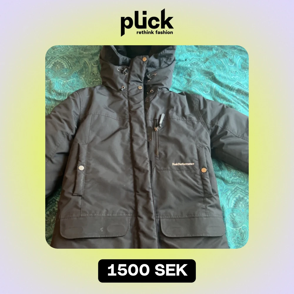 Säljer en svart dunjacka från Peak Performance med huva och flera praktiska fickor. Jackan har dragkedja och knappar framtill för extra skydd mot kyla. Perfekt för kalla vinterdagar.