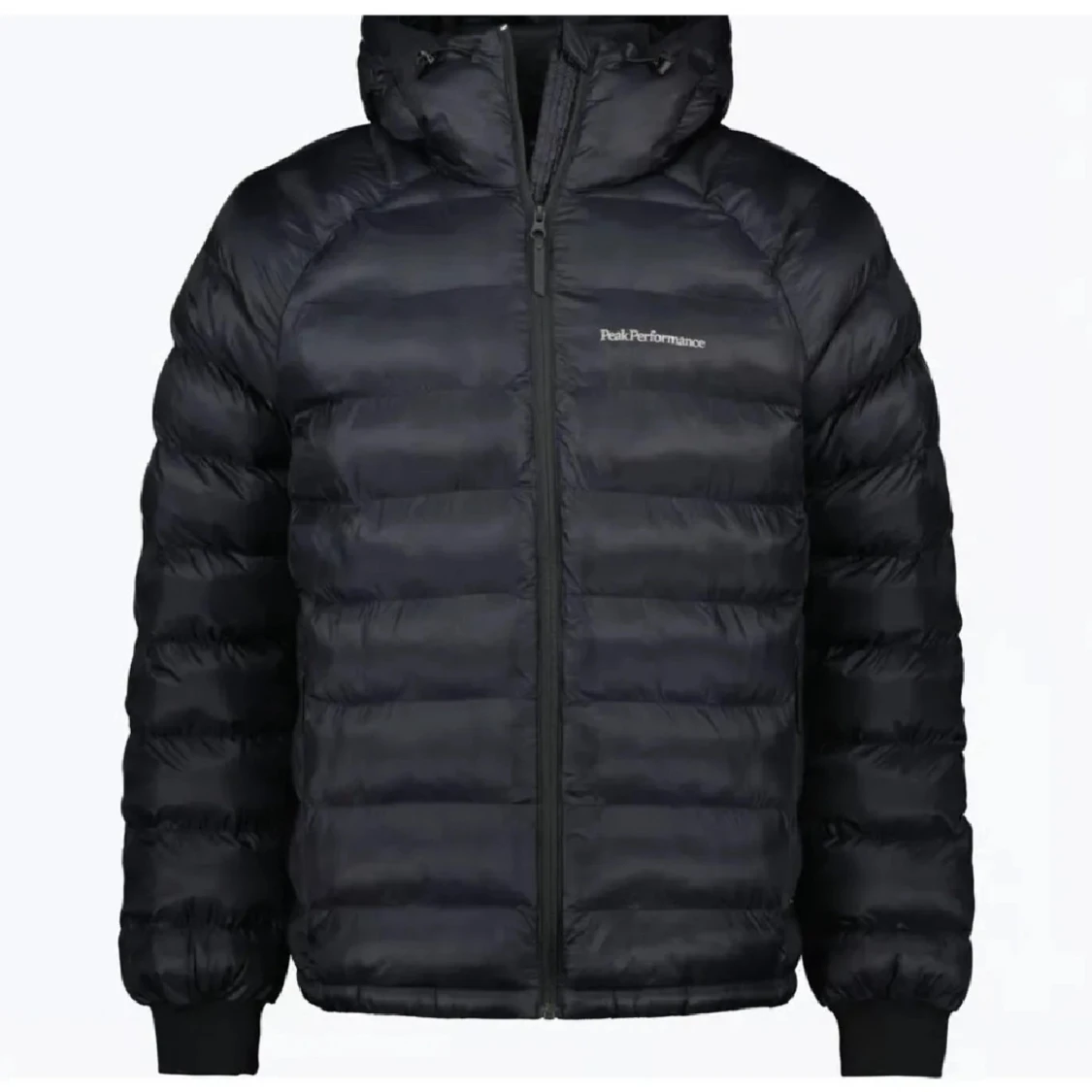 Säljer en svart dunjacka från Peak Performance med huva och dragkedja framtill. Jackan har en quiltad design och är perfekt för kyliga dagar. Klassisk logga på bröstet och ärmen. Passar dig som vill ha en stilren och varm jacka.