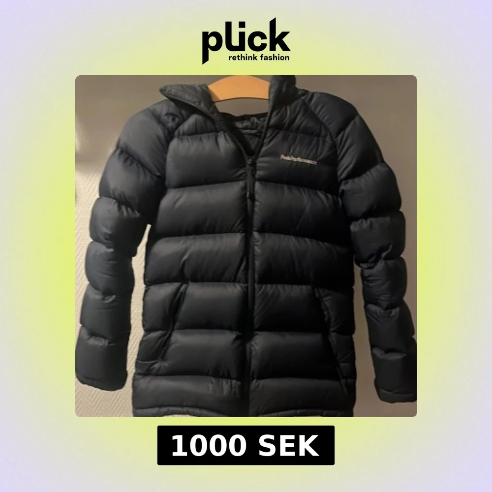 Snygg svart dunjacka från Peak Performance med huva och diskret logga på bröstet. Jackan är fluffig och har dragkedja framtill, perfekt för kalla dagar. Klassisk pufferstil med lång ärm och enkel design som funkar till allt.