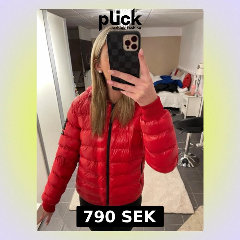 Säljer en röd dunjacka från Peak Performance med huva och svarta detaljer. Jackan har lång ärm, två sidofickor med dragkedja och en snygg logotyp på vänster ärm. Jackan är i väldigt gott skicka och säljs då den inte används längre❣️st 170/xs-s
