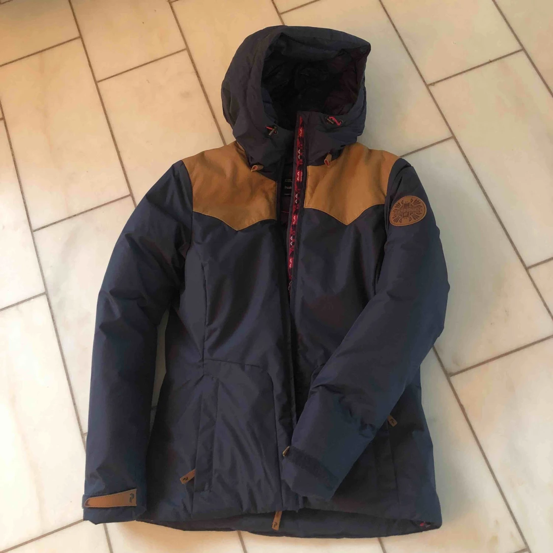 Varm skidjacka i mörkblått med ljusa skinndetaljer från Peak Performance. Använd på sin höjd 5 gånger. Figursydd modell.