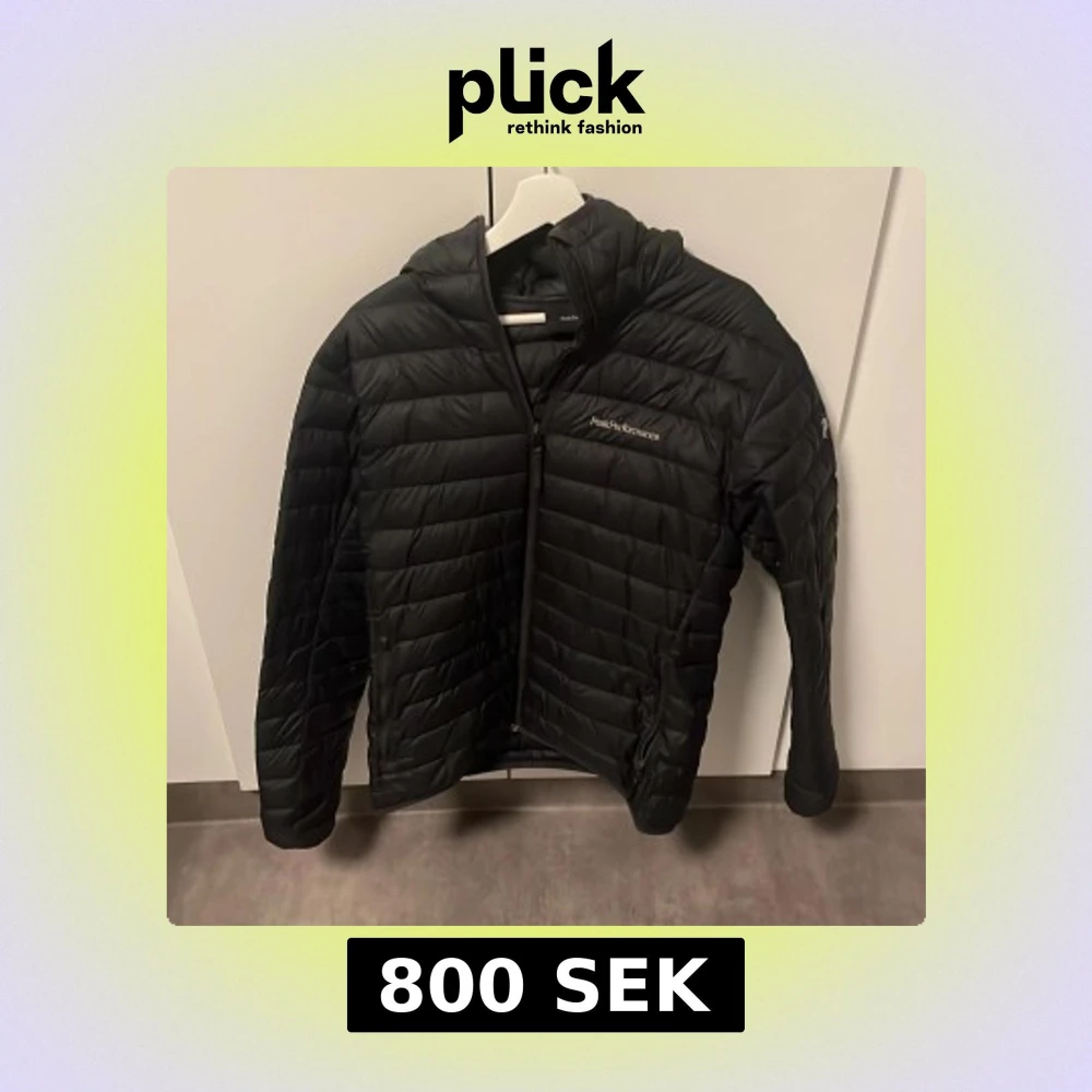 Svart dunjacka från Peak Performance i storlek L. Jackan har huva, horisontella sömmar och dragkedja framtill. Perfekt för kyliga dagar och har en clean, sportig look. Logga på bröstet och ärmen. Lätt och smidig att bära. Mycket bra skick!!