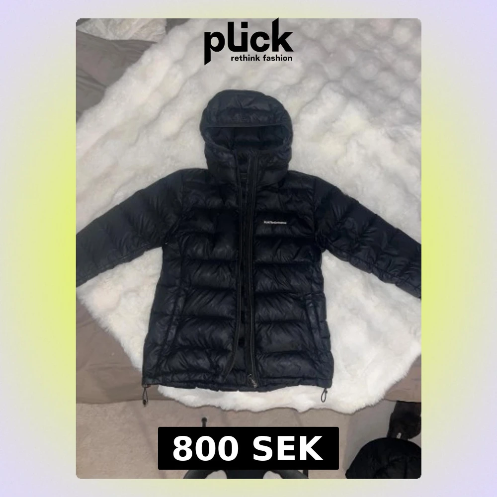 Svart dunjacka från Peak Performance med huva och dragkedja framtill. Jackan har en quiltad design med horisontella paneler och två sidofickor med dragkedja. Perfekt för kalla dagar och har en clean, sportig look. Jackan är i gott skick förutom ett hål på armen, därmed diskuterbart pris.