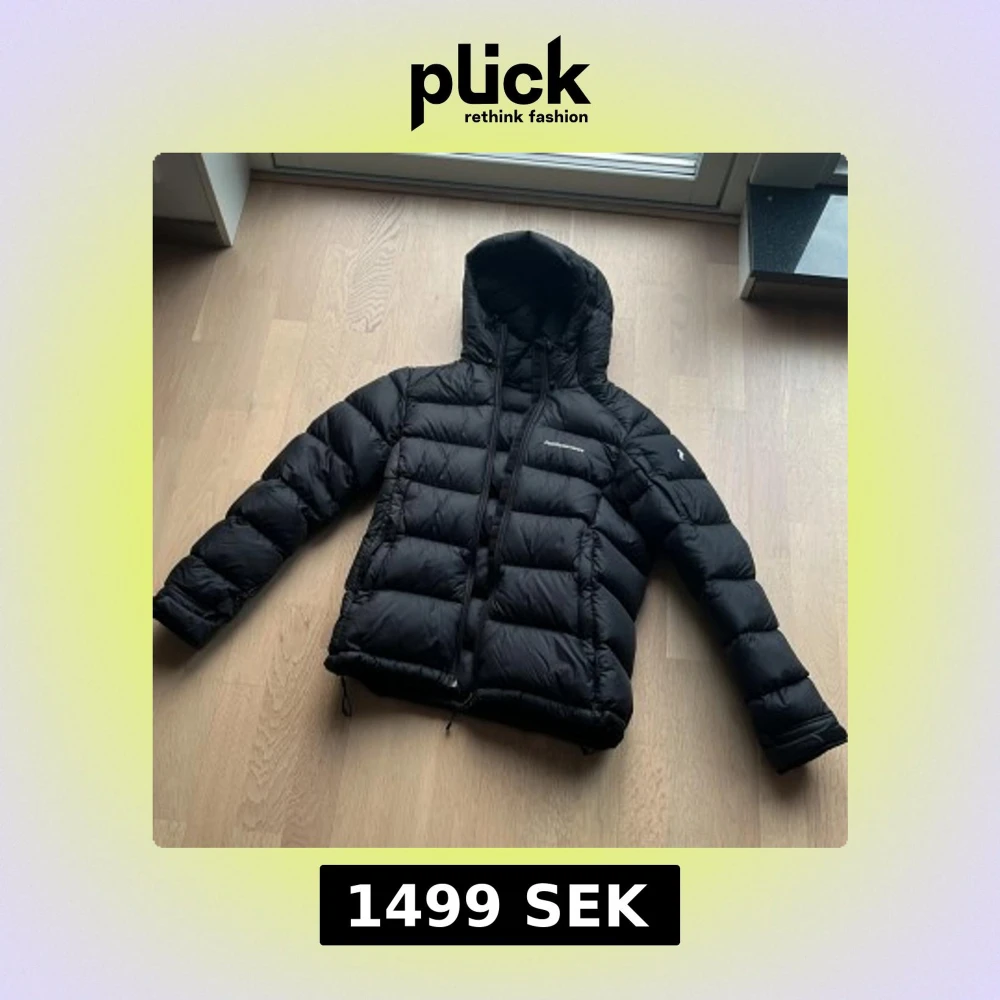 Säljer en svart dunjacka från Peak Performance med huva och dragkedja. Jackan har puffad design, snörning i nederkant och långa ärmar. Perfekt för kalla dagar och har en clean look med diskret logga på bröstet och ärmen. Andvänd 1 gång som ny. Storlek S.