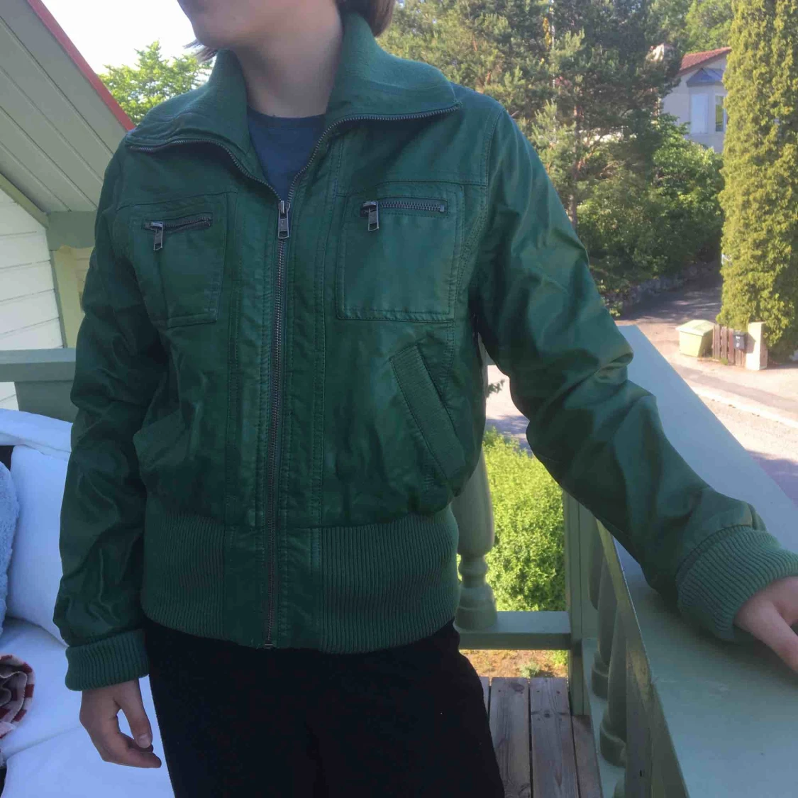 Supersnygg skinnjacka, Philip Russel. Klargrön. Bred mudd över höfterna. Mudd vid ärmslut och som krage (polo). Knappt använd.