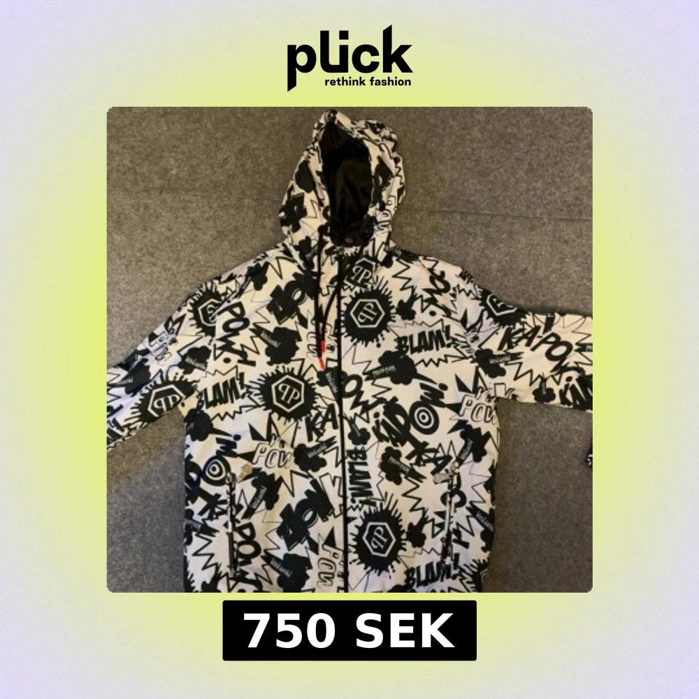 Säljer en fet vindjacka från Philipp Plein med svartvit comic-inspirerat mönster och loggor över hela jackan. Jackan har huva med snörning, dragkedja framtill och två sidofickor med dragkedja. Perfekt för dig som gillar att sticka ut med din stil.