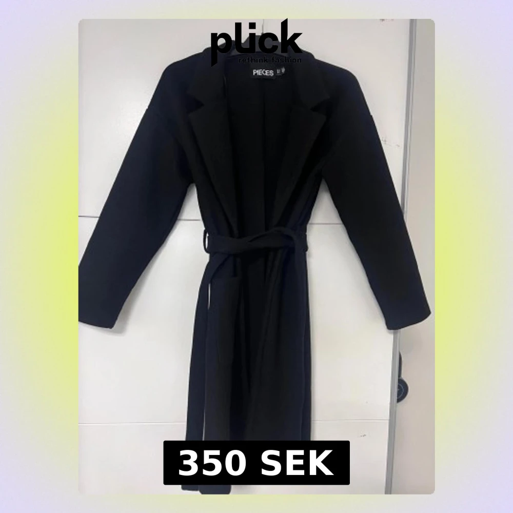 Svart kappa med klassisk krage, långa ärmar och två stora fickor framtill. Modellen är rak med bälte.