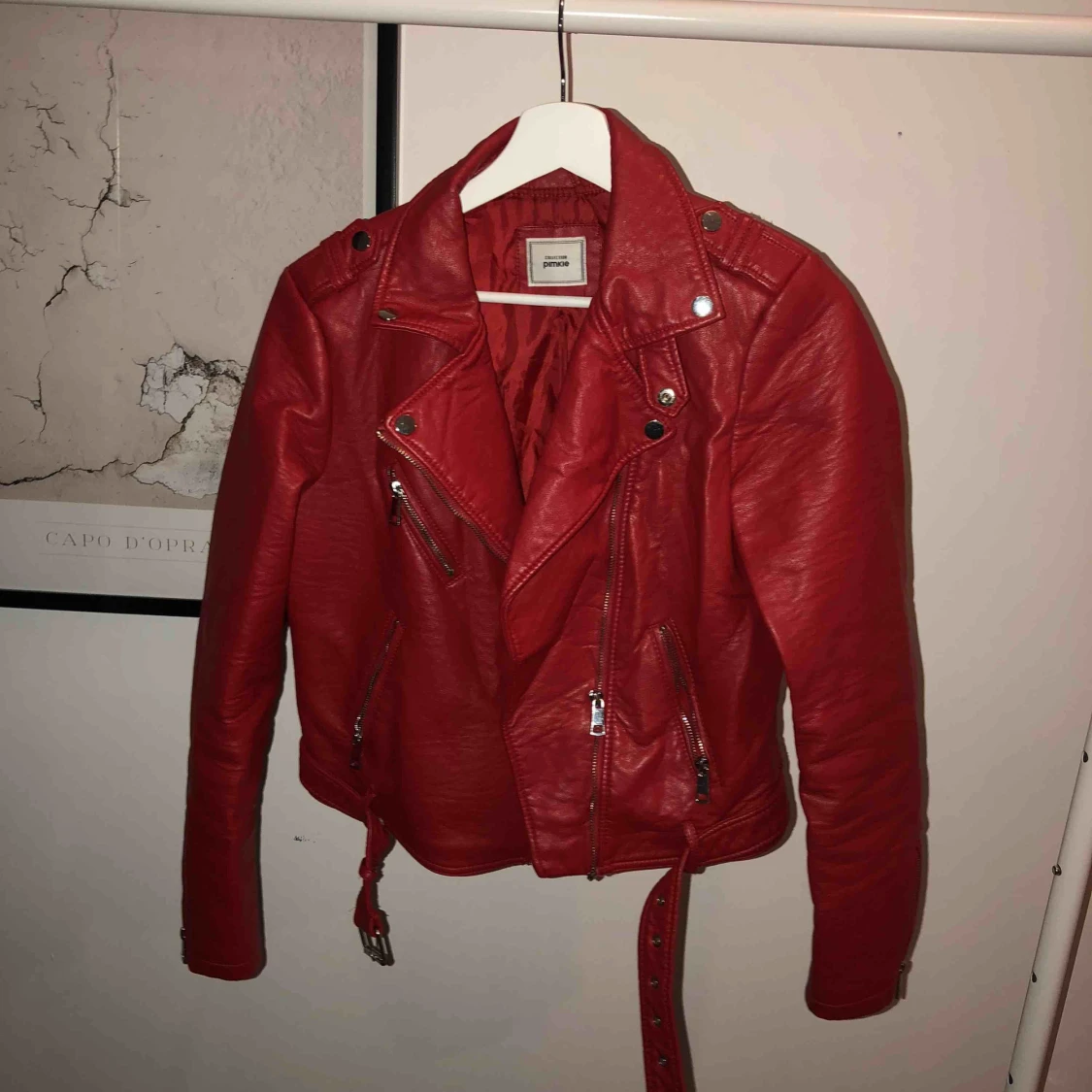Röd jacka i läder imitation från Pimkie. Stor S eller lite mindre M. Passar 38.