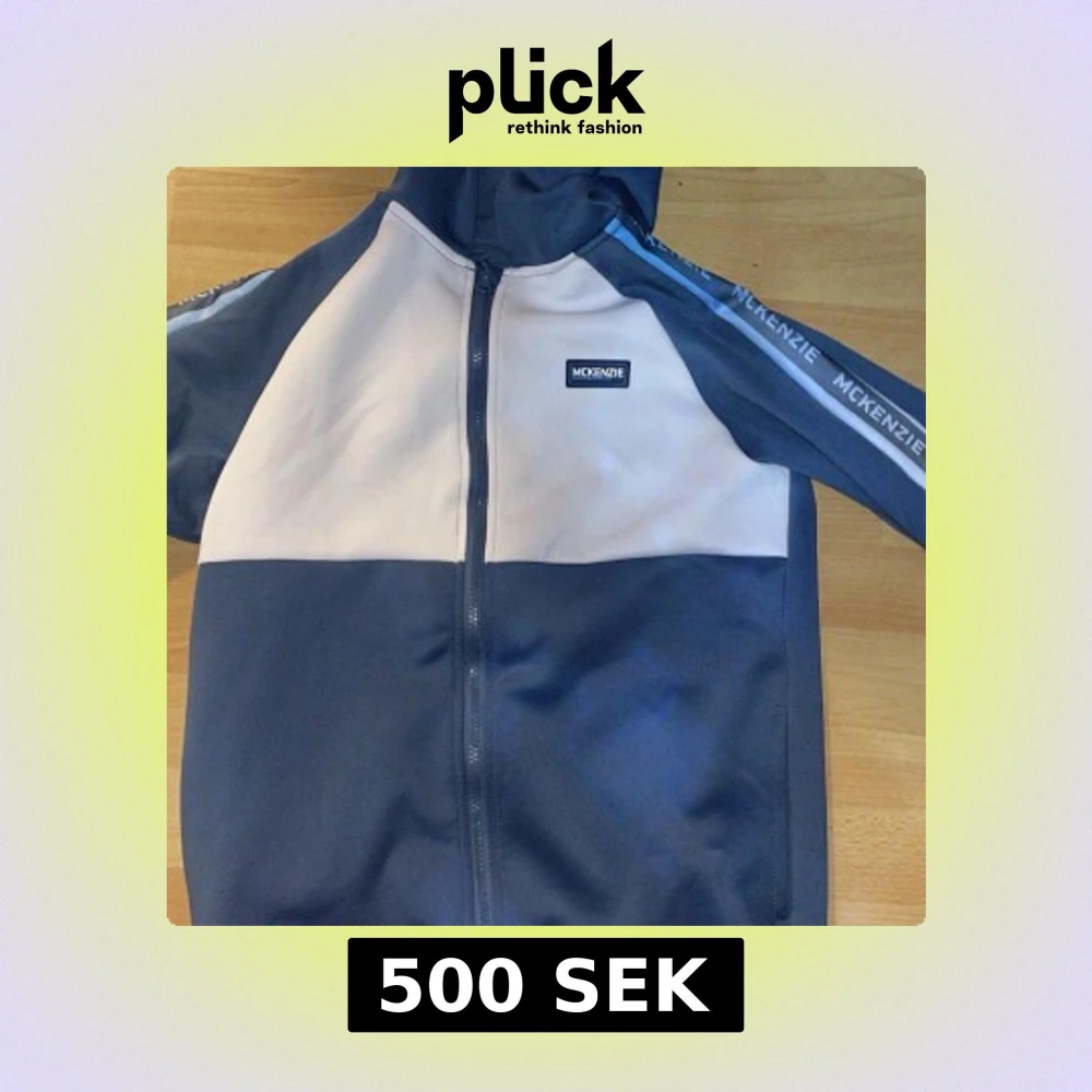 Snygg vindjacka från McKenzie i blått och vitt med huva och dragkedja framtill. Jackan har logga på bröstet och coola band med McKenzie-tryck längs ärmarna. Perfekt för en sportig look och streetstyle.