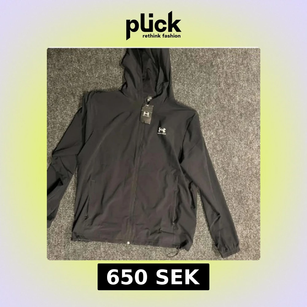 Säljer en svart vindjacka från Under Armour med huva och dragkedja framtill. Jackan har två sidofickor med dragkedja och elastiska muddar vid ärmsluten. Perfekt för blåsiga dagar och sportiga aktiviteter.