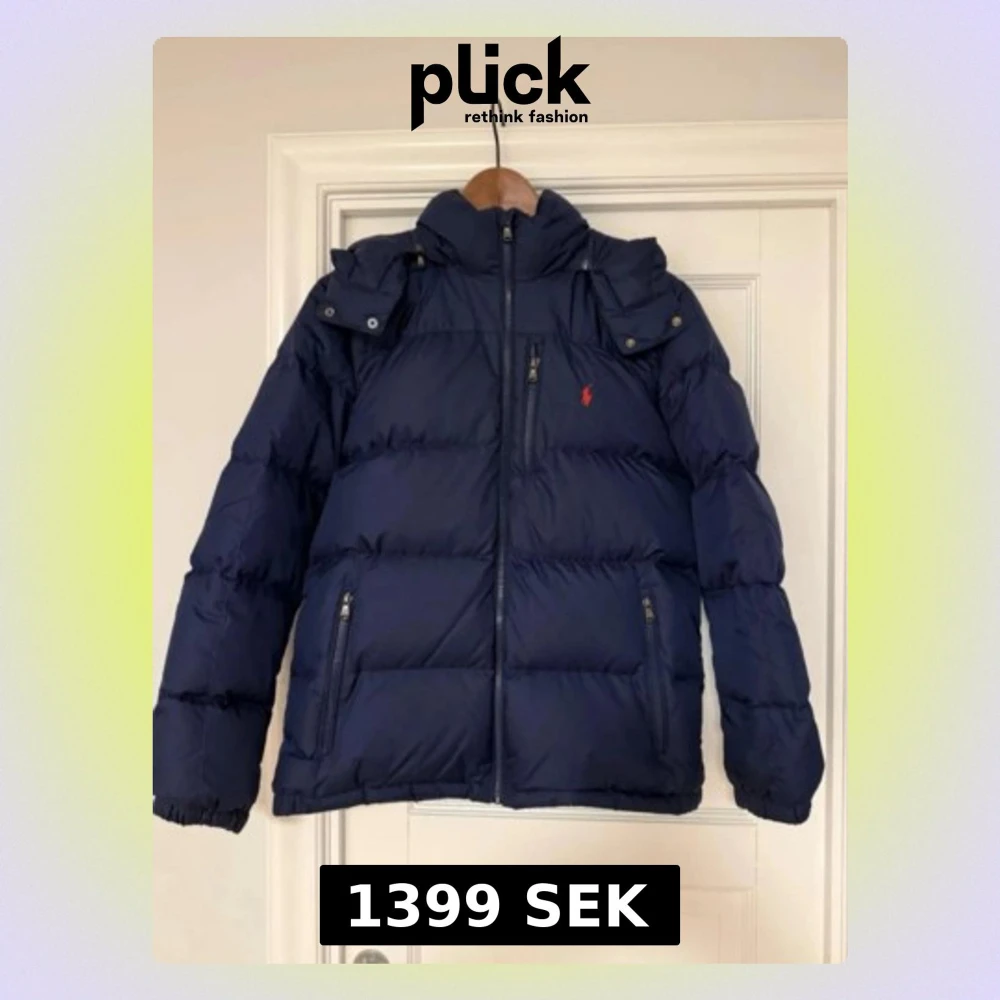 Snygg marinblå pufferjacka från Polo Ralph Lauren med röd logga på bröstet. Jackan har dragkedja framtill, två sidofickor med dragkedja och hög krage med huva. Perfekt för kalla dagar och riktigt stilren look.