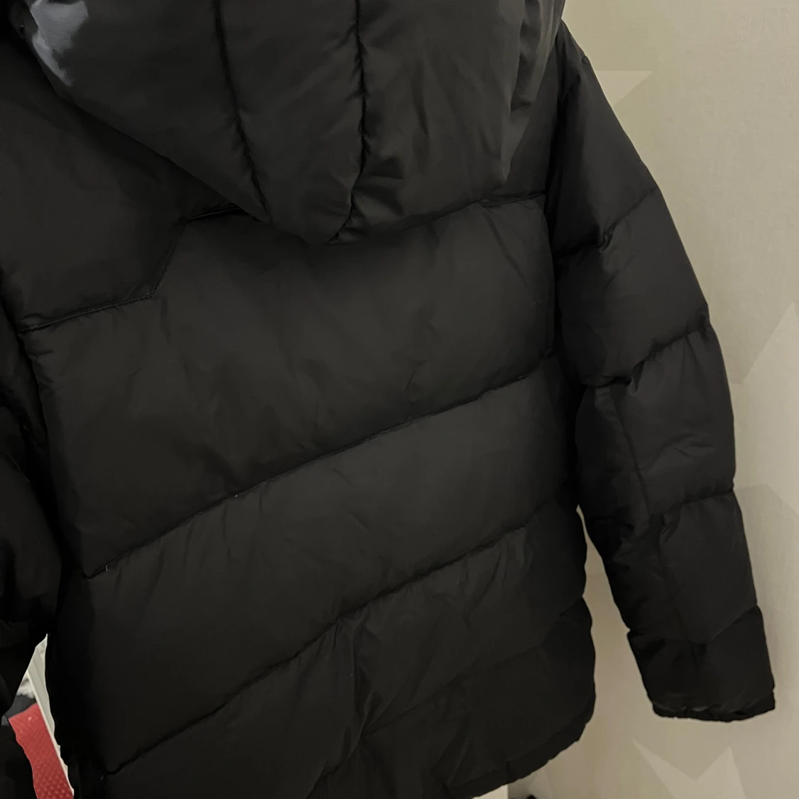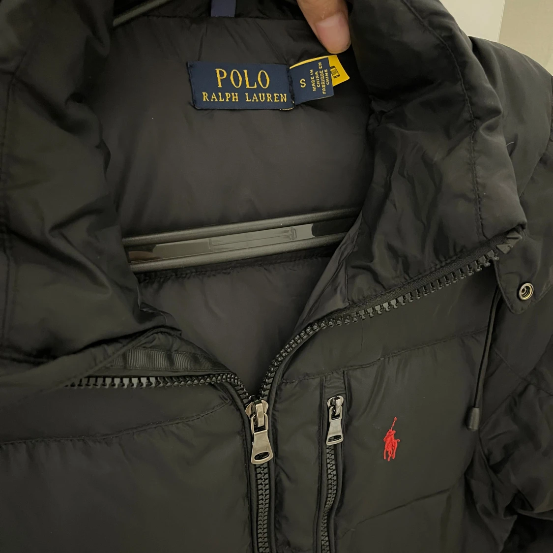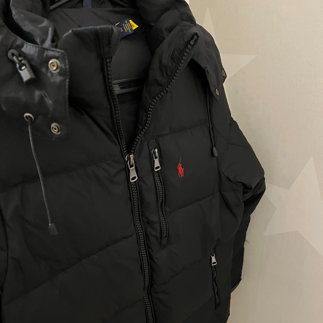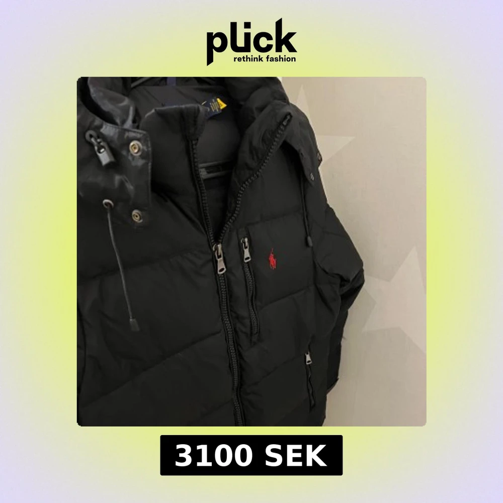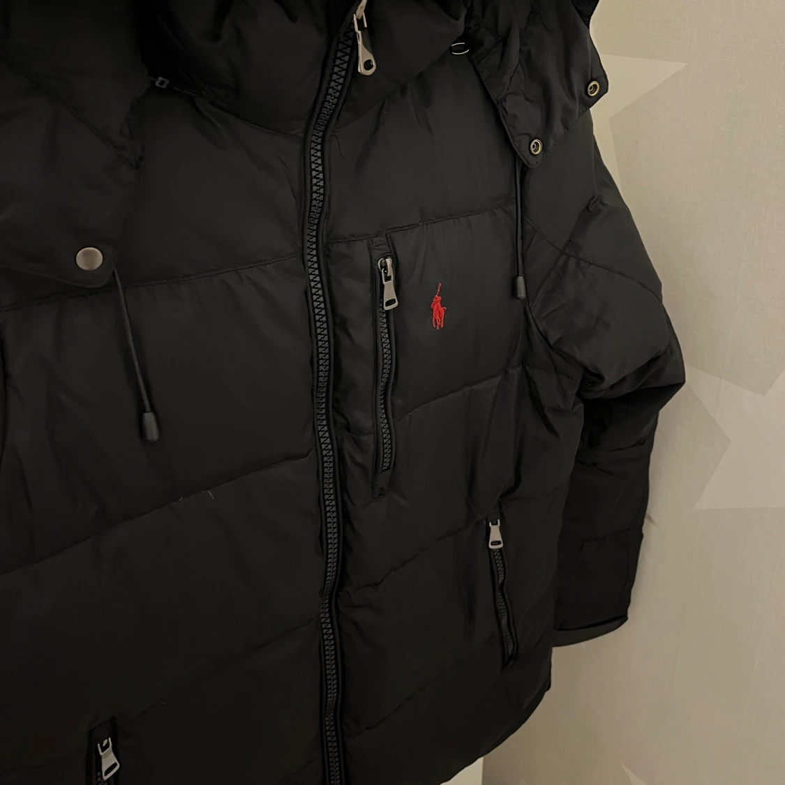 Svart pufferjacka från Polo Ralph Lauren med röd broderad logga på bröstet. Jackan har huva med dragsko, flera dragkedjor framtill och quiltad design. Perfekt för kalla dagar och riktigt snygg till streetwear-stilen.