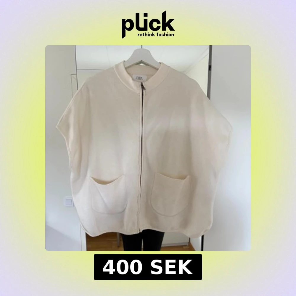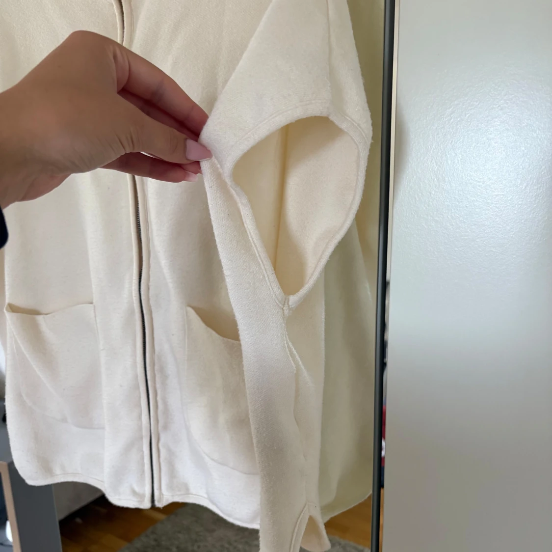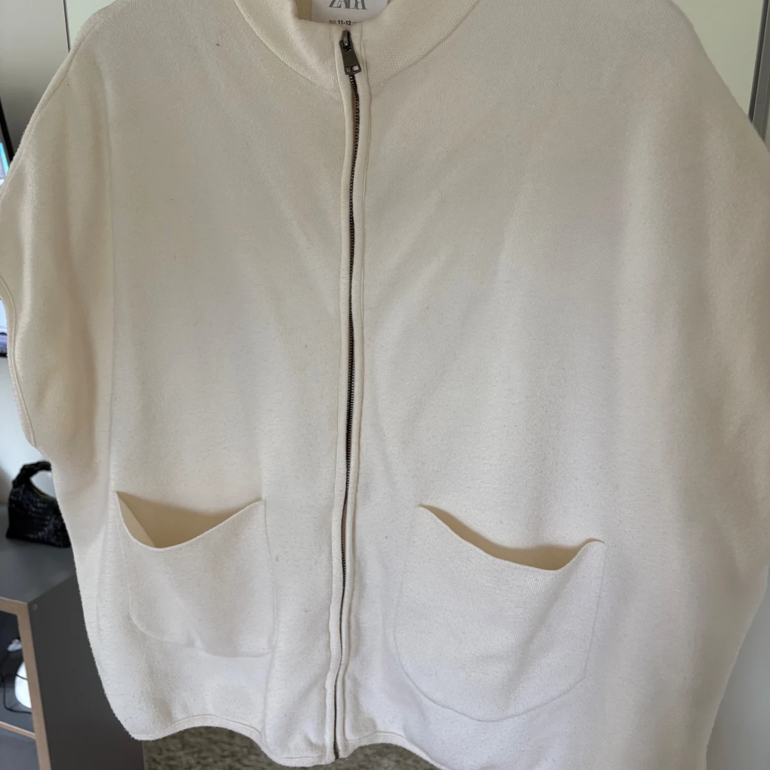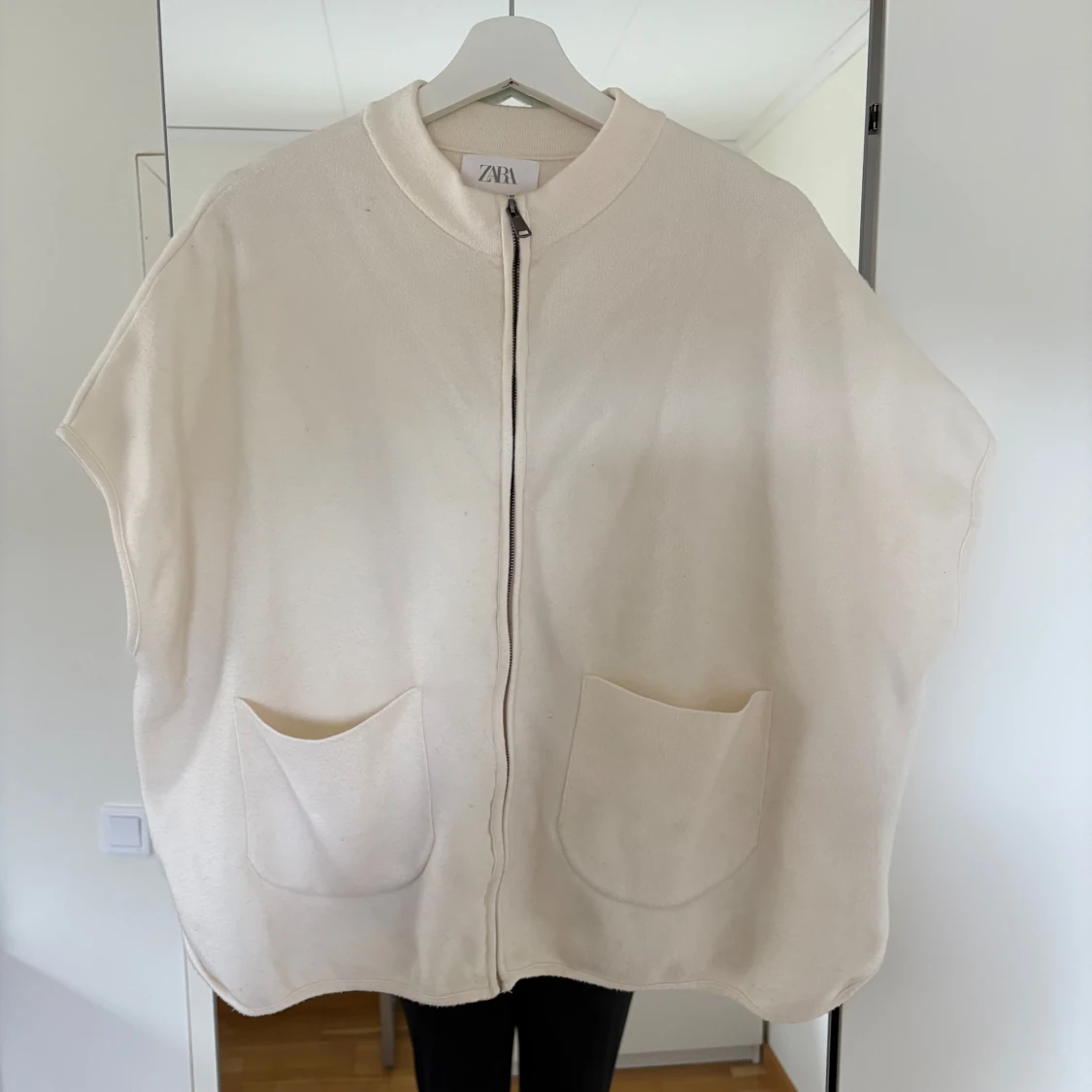 Stilren beige väst från Zara med rak passform, två stora fickor framtill och dragkedja hela vägen. Västen har mjukt material och breda ärmhål för en avslappnad look. Perfekt att slänga över en hoodie eller t-shirt.