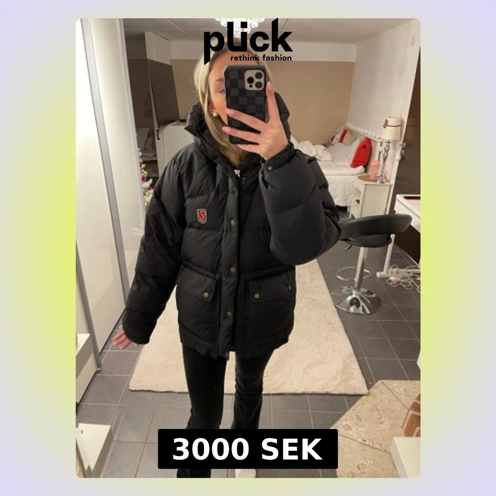 Säljer en svart pufferjacka från Fjällräven med stor, mysig huva och rejäla fickor med tryckknappar. Jackan har Fjällräven-logga på bröstet, dragkedja och knappar framtill. Perfekt för kalla dagar och har en loose passform som ger skön streetkänsla. St xs-s❣️
