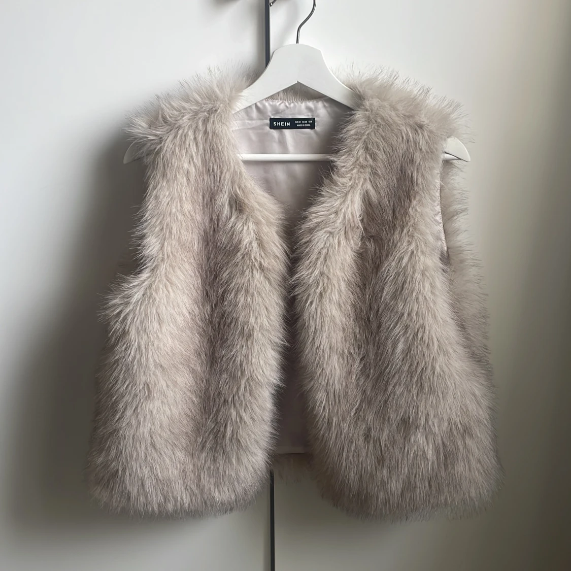 Säljer en snygg beige pälsväst från shein då den inte kommit till användning🤎stl M men skulle säga att den är mer som en S