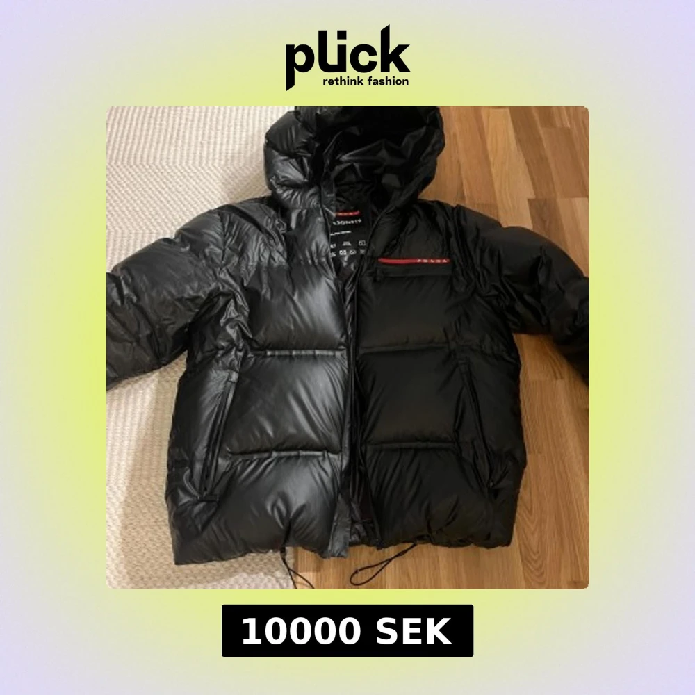 Svart Prada jacka i ganska bra skick, en av fickorna har sömmen låsnatt i så den är inte hel i fickan men funkar endå. Ny pris för den ligger på 30 tusen.