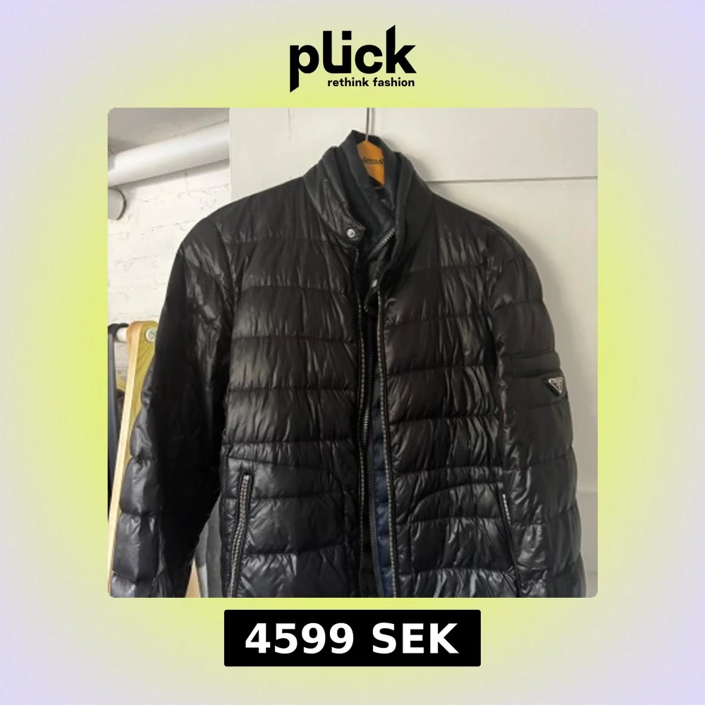 Säljer en svart dunjacka från Prada med klassisk quiltad design och hög krage. Jackan har dragkedja framtill, två fickor med dragkedja och Pradas ikoniska logga på ärmen. Perfekt för kalla dagar och riktigt snygg till streetwear-stilen. Nypris 15k