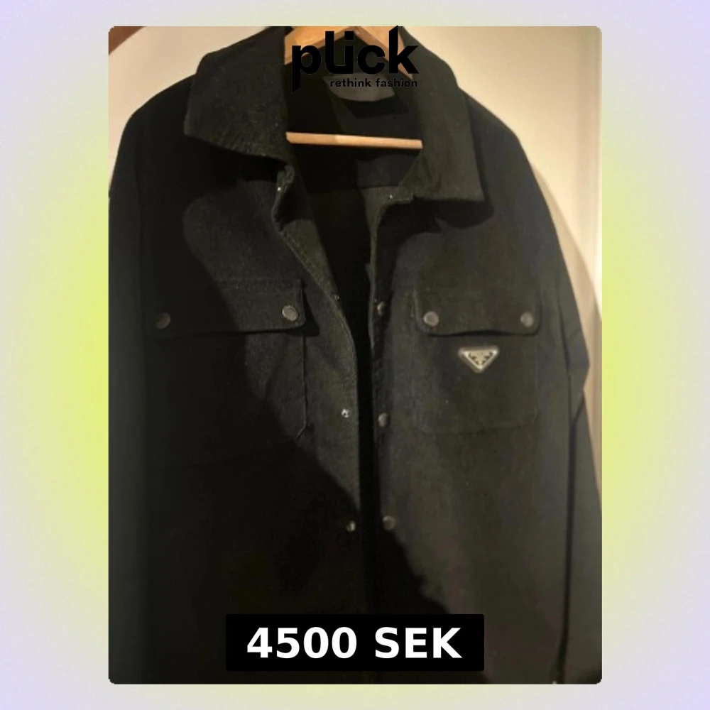 Svart overshirt från Prada i mjuk manchester med klassisk krage och två stora bröstfickor med tryckknappar. Snyggt metallmärke på ena fickan och diskreta detaljer. Perfekt för dig som gillar stilrena och exklusiva plagg. Bor i Stockholm men postar den också!