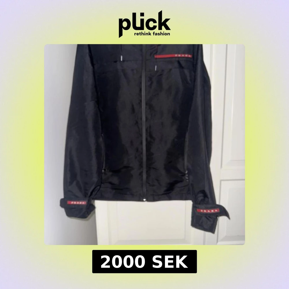 Svart vindjacka från Prada med ikoniska röda logodetaljer på bröstet och ärmsluten. Jackan har huva, dragkedja framtill och justerbara ärmslut. Tillverkad i glansig polyester som ger en clean och modern vibe. Perfekt för dig som vill ha en stilren och exklusiv look. Nypris : 14999kr mitt pris 2000kr