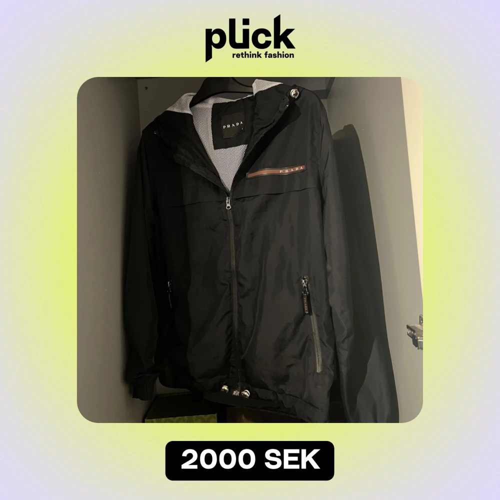 Skön vindjacka av Prada i storlek L men passar M. Skick 7/10 har ett pytelitet hål i fickan som blivit sydd, vid funderingar hör av dig🙏🏽