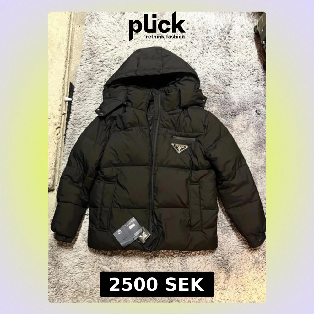 Säljer en svart pufferjacka från Prada i storlek M. Jackan har huva, dragkedja framtill, en bröstficka med dragkedja och det klassiska Prada-emblemet på bröstet. Fylld med dun för extra värme och har en clean, oversized look.