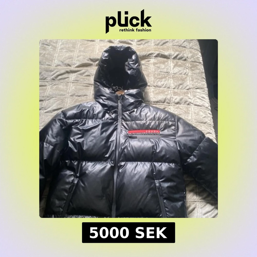 Säljer en svart pufferjacka från Prada med glansig finish och huva. Jackan har dragkedja framtill, två sidofickor och en bröstficka med röd detalj och Prada-logga. Perfekt för kalla dagar och riktigt snygg streetstil.