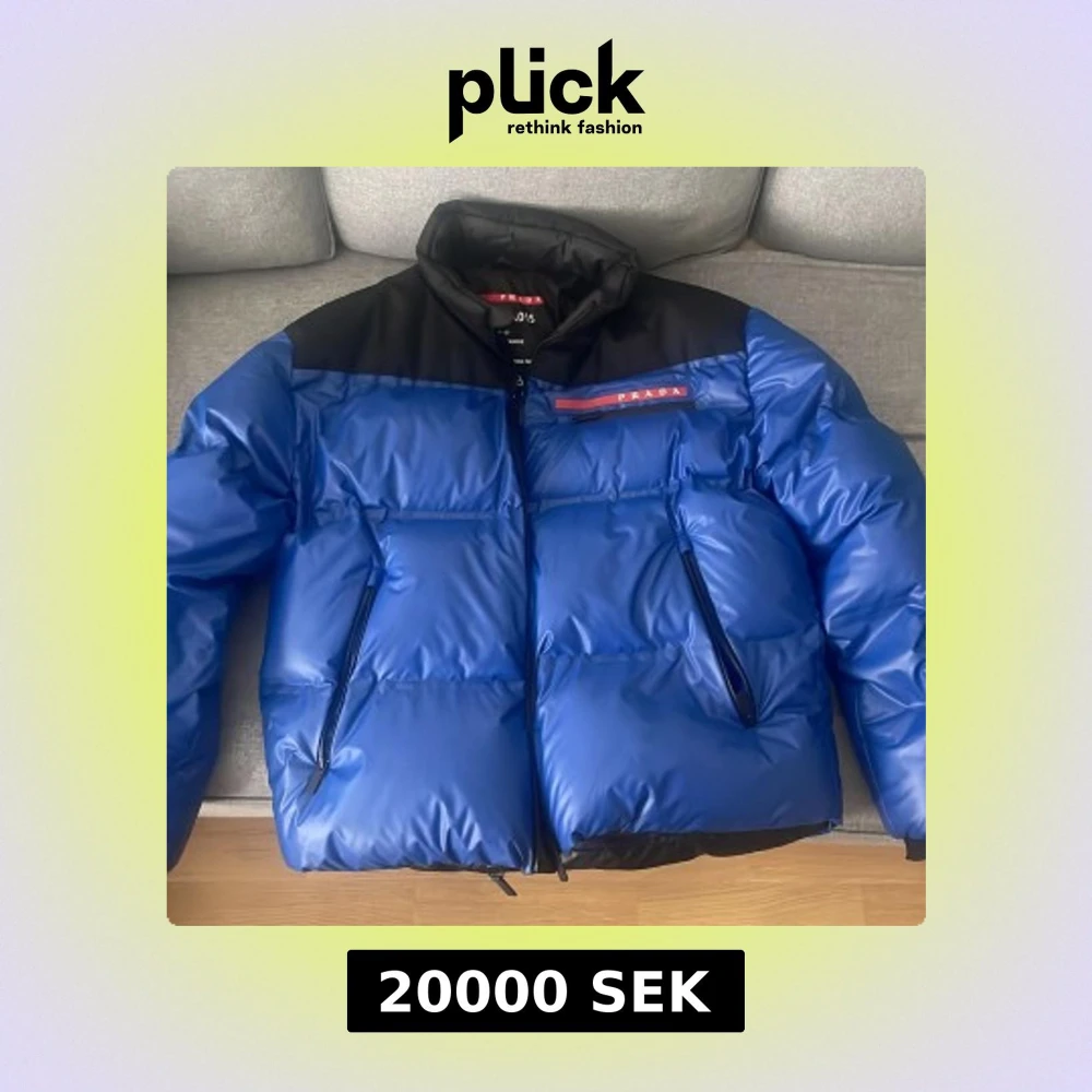 Snygg blå och svart linea rosa pufferjacka från Prada med dragkedja och två fickor framtill. Jackan har en hög krage och är perfekt för kyligare väder. Den har en stilren design med Pradas logotyp på bröstet. Varan är original (äkta) och köpt på Prada Stockholm på Birger Jarlsgatan nypris 34900kr