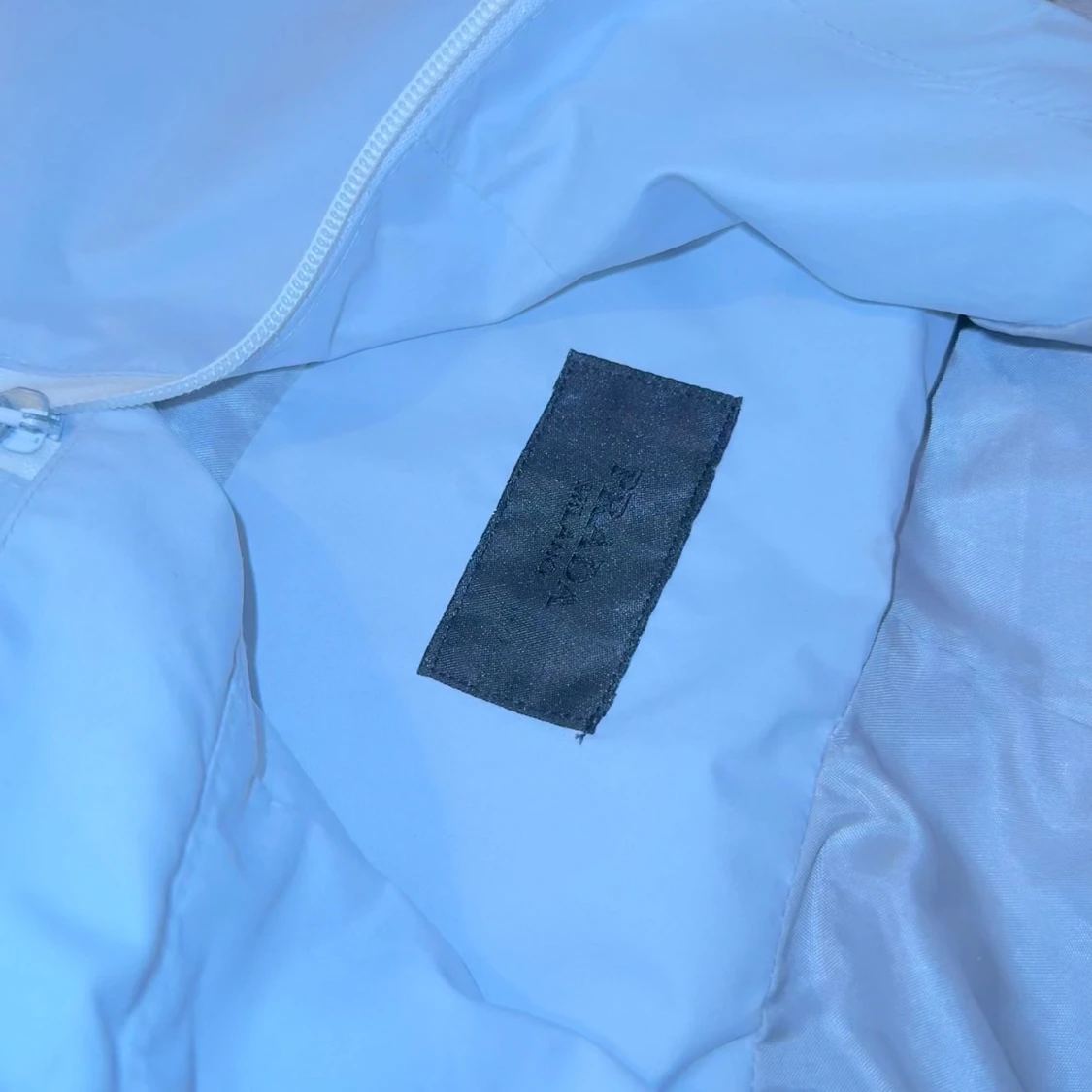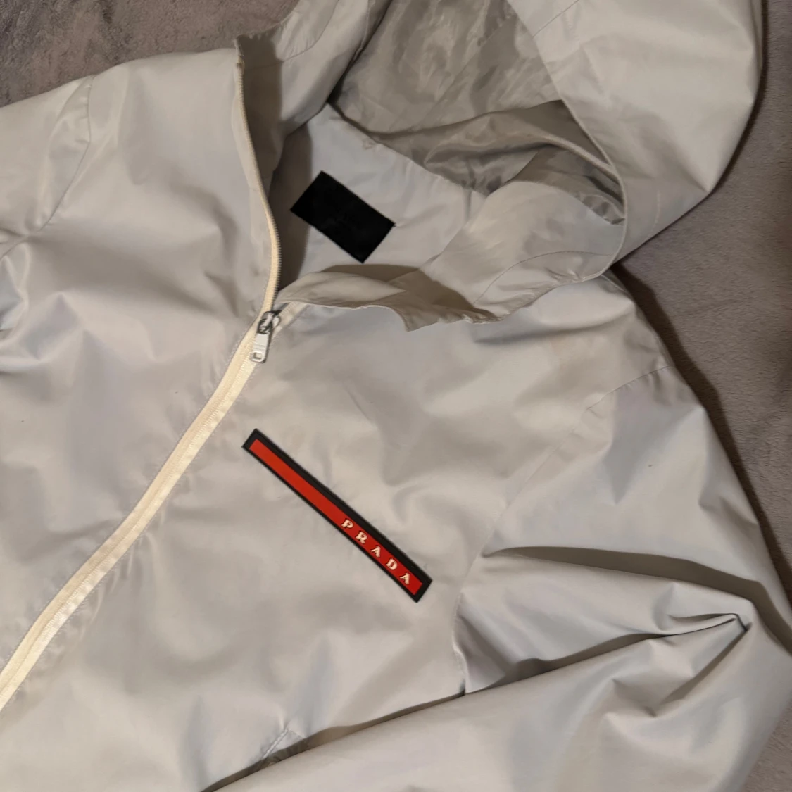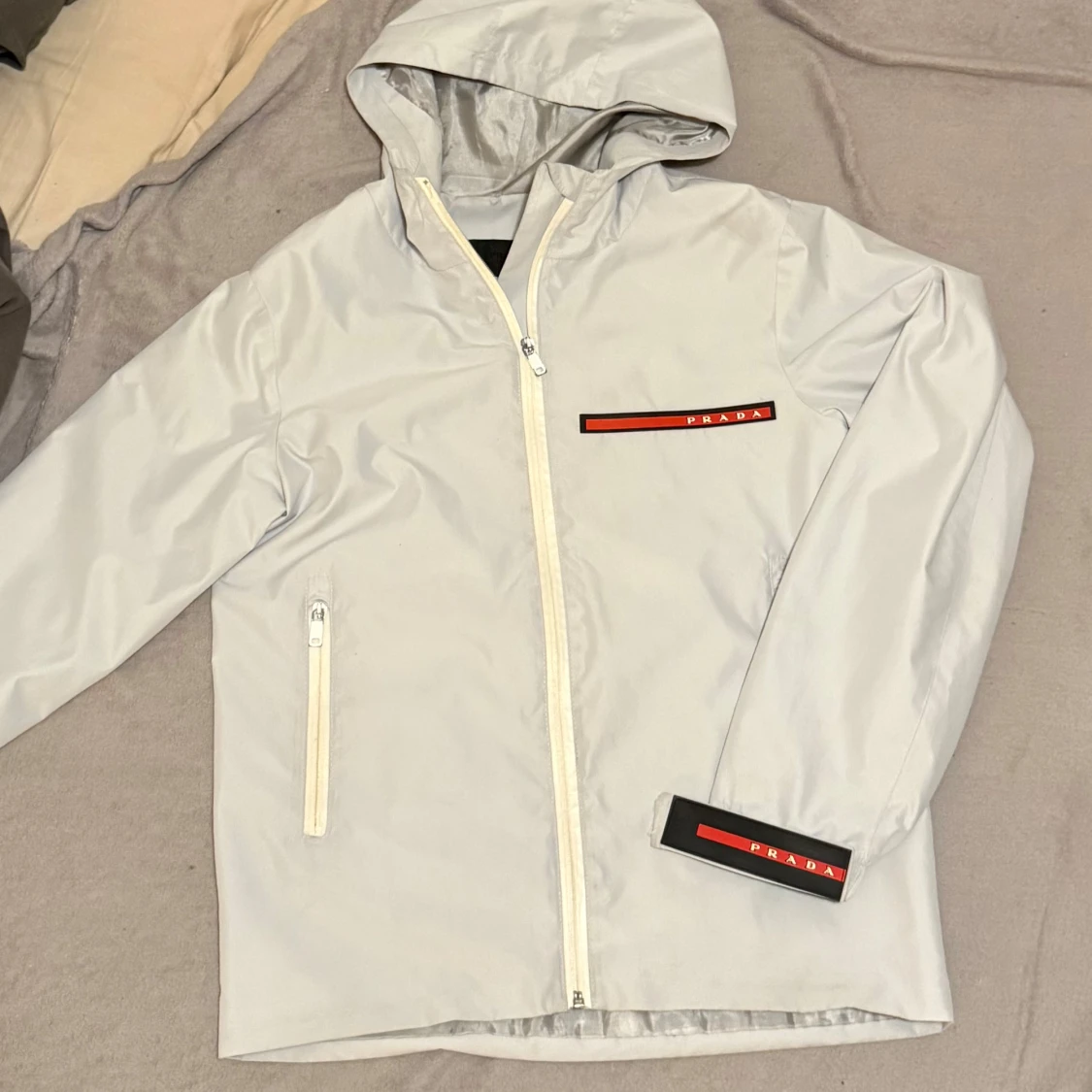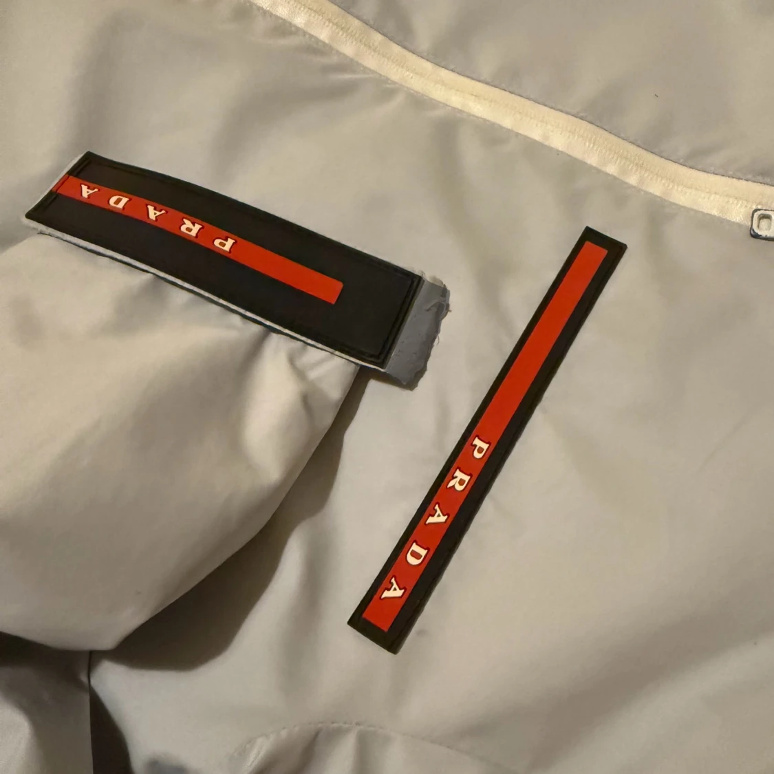 Snygg ljusgrå vindjacka från Prada med huva och hel dragkedja framtill. Jackan har ikoniska röda Prada-loggor på bröstet och ärmen, samt en praktisk ficka med dragkedja. Tillverkad i glansig polyester som ger en clean och modern look. Size small, funkar för medium också
