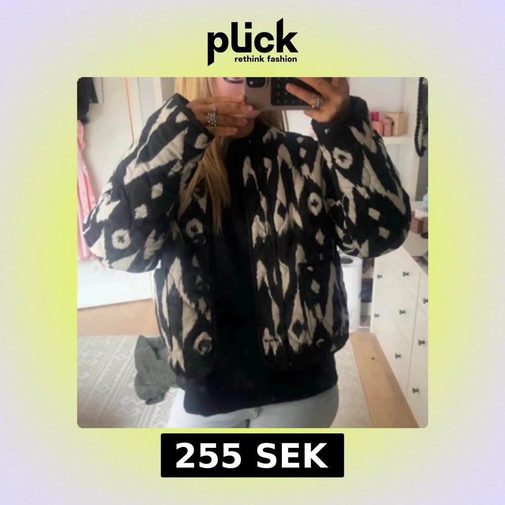 Quiltad jacka i svart och vitt med grafiskt mönster. Jackan har knappar framtill, raka ärmar och en loose passform. Perfekt för dig som vill sticka ut med en unik och trendig look.
