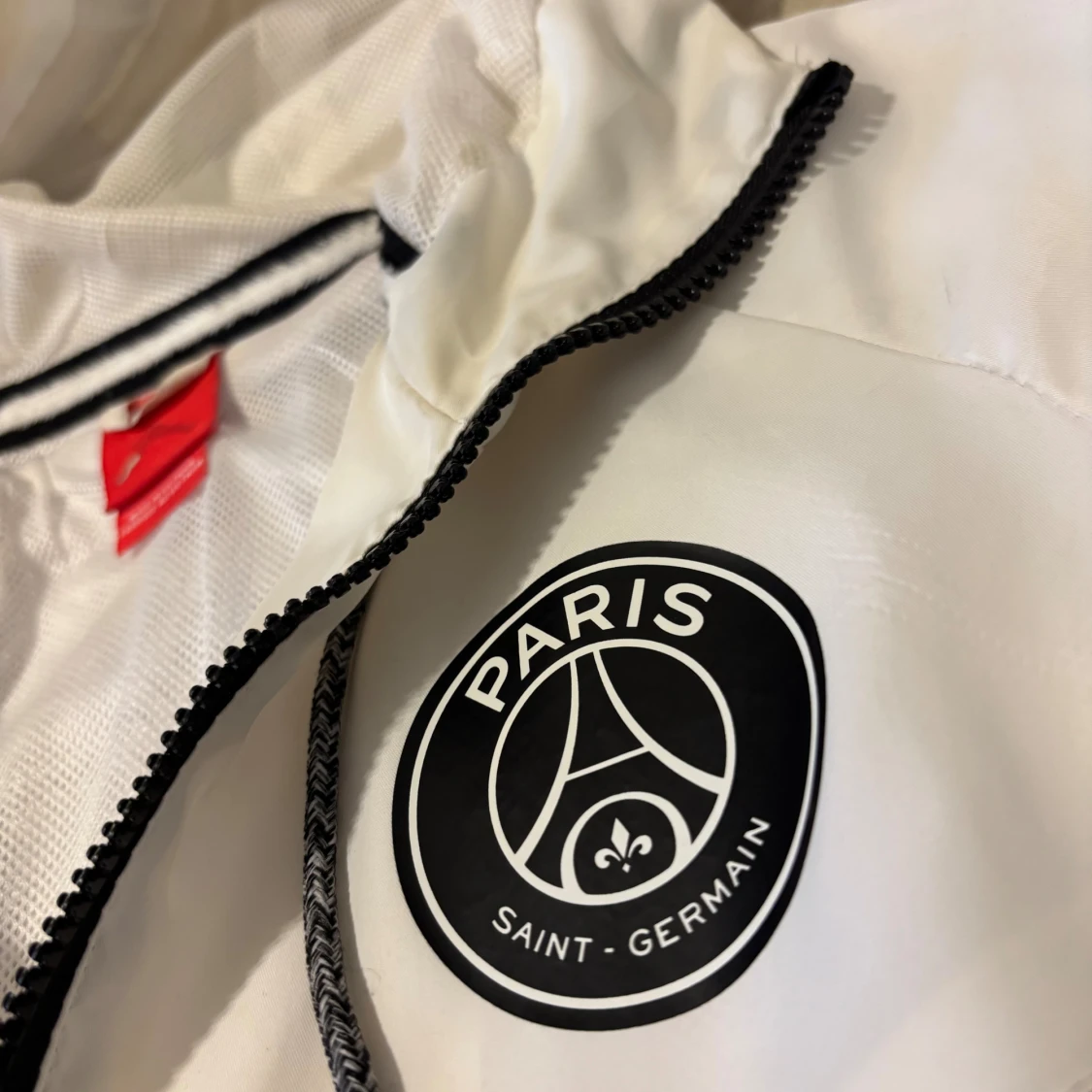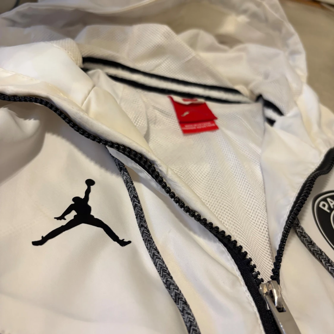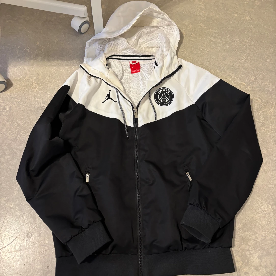 Svart och vit vindjacka från Jordan i samarbete med Paris Saint-Germain. Jackan har huva, dragkedja framtill, två fickor med dragkedja och PSG-logga på bröstet. Tillverkad i lätt polyester med meshfoder, perfekt för blåsiga dagar. Pris kan diskuteras!