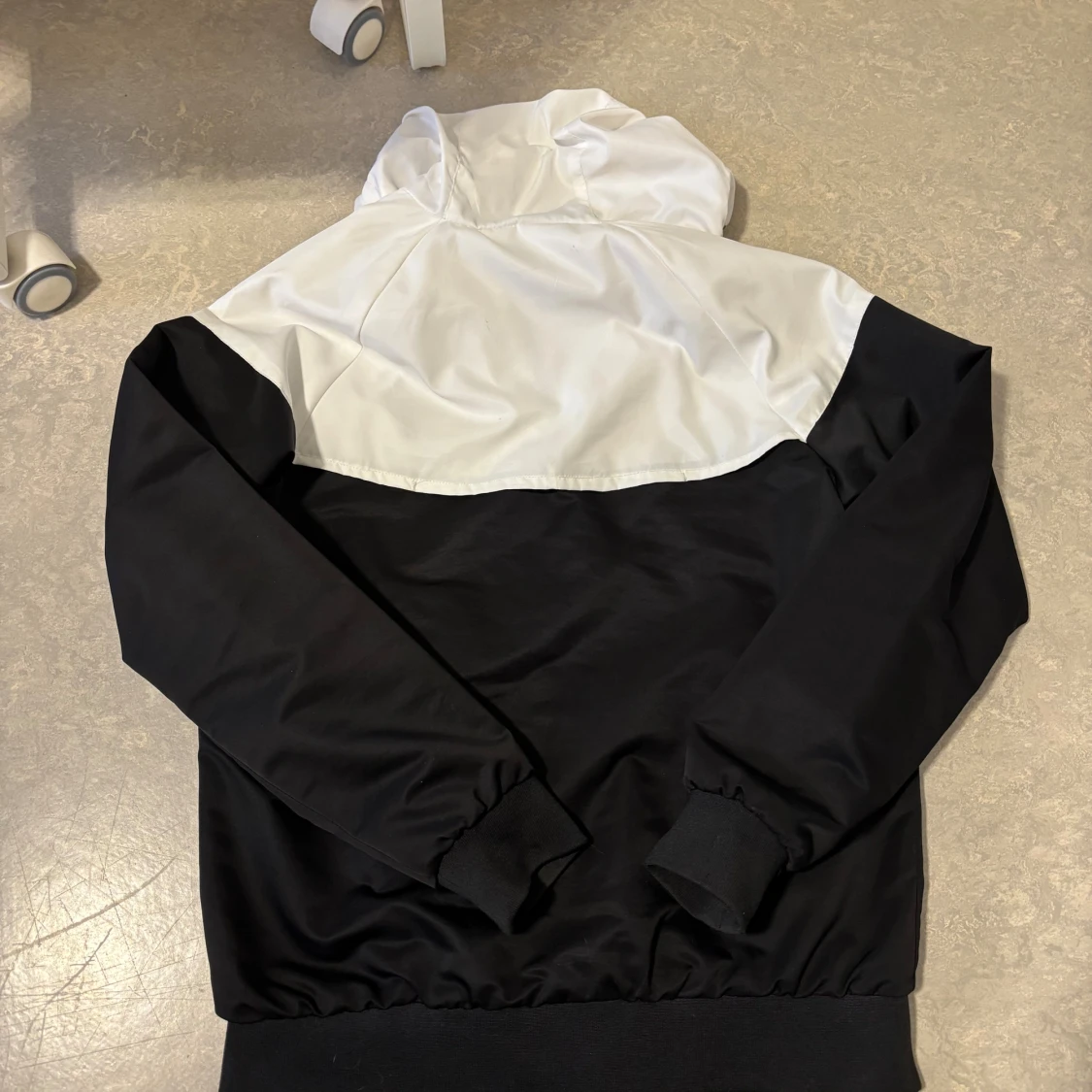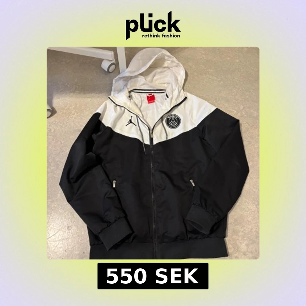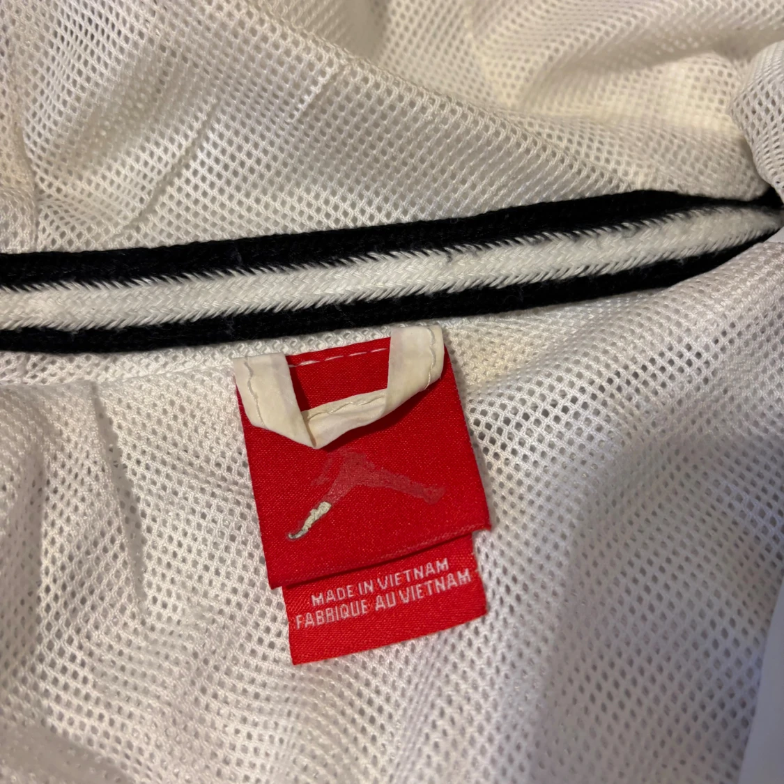 Svart och vit vindjacka från Jordan i samarbete med Paris Saint-Germain. Jackan har huva, dragkedja framtill, två fickor med dragkedja och PSG-logga på bröstet. Tillverkad i lätt polyester med meshfoder, perfekt för blåsiga dagar. Pris kan diskuteras!