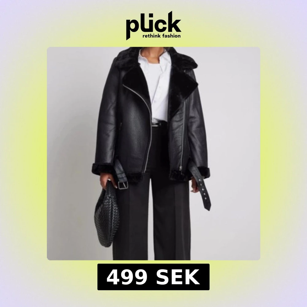 Säljer en svart pälsjacka med skinnstruktur och mjuk päls på insidan och kragen. Jackan har en bred krage, sned dragkedja och bälte vid midjan och halsen. Passformen är loose och jackan har långa ärmar med pälsdetaljer vid muddar och nederkant. Nypris 1099kr