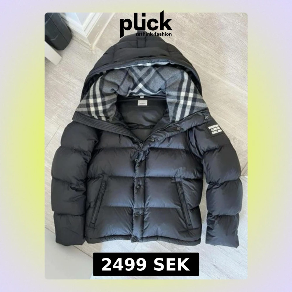 Snygg svart dunjacka från Burberry med klassiskt rutigt foder i huvan. Jackan har dragkedja och knappar framtill, två fickor med dragkedja och en rejäl huva. Perfekt för kalla dagar och riktigt stilren look.