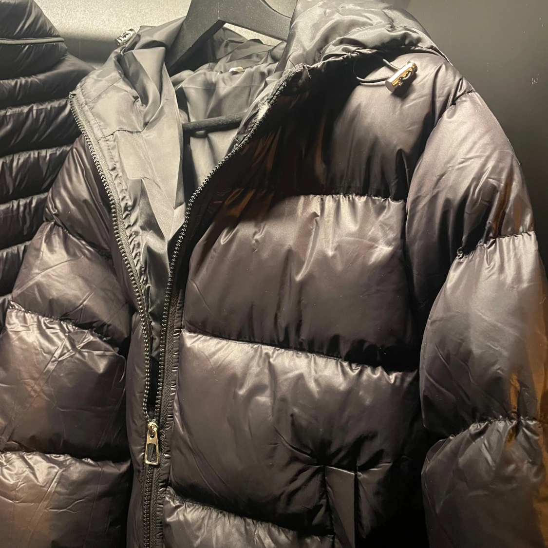 Säljer en svart pufferjacka med hög krage och huva. Jackan har en rejäl dragkedja framtill och breda, vadderade paneler som ger en riktigt fet look. Perfekt för kalla dagar när du vill hålla stilen och värmen. HELT NY!