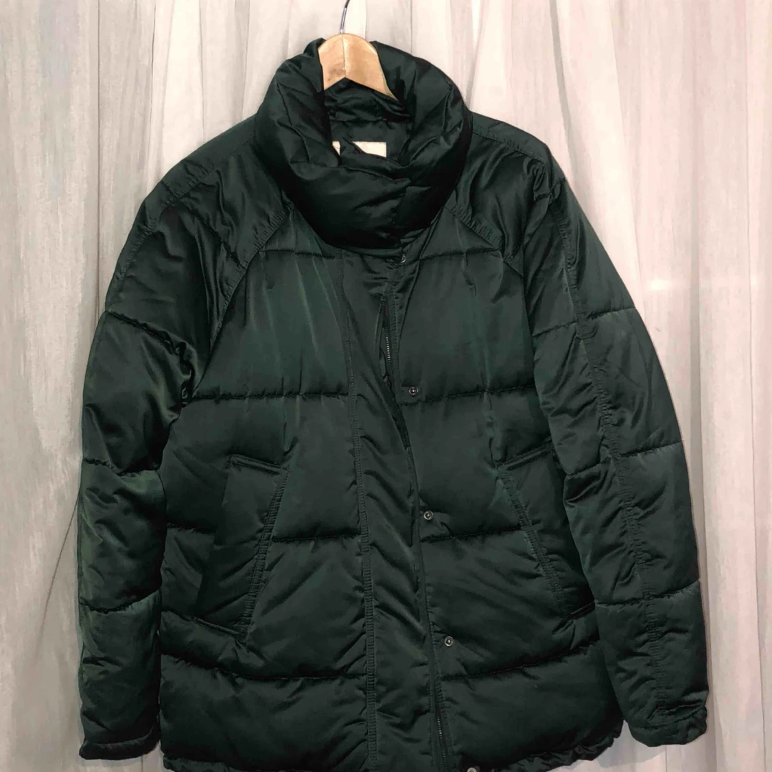 Mörkgrön dunjacka i fint skick från Monki! Den är lite ”glansig”, har justerbar resår längst ner och en krage istället för luva.